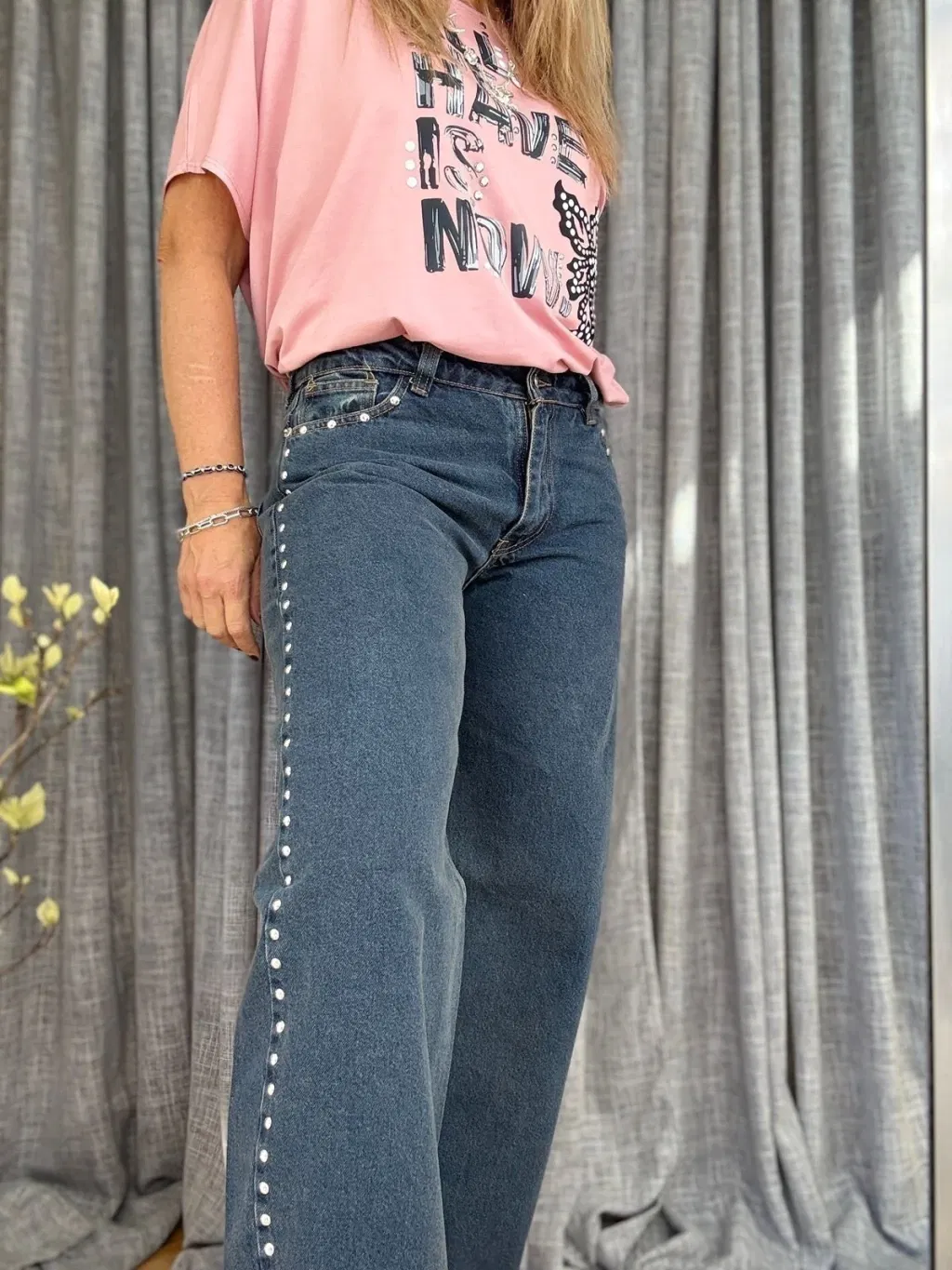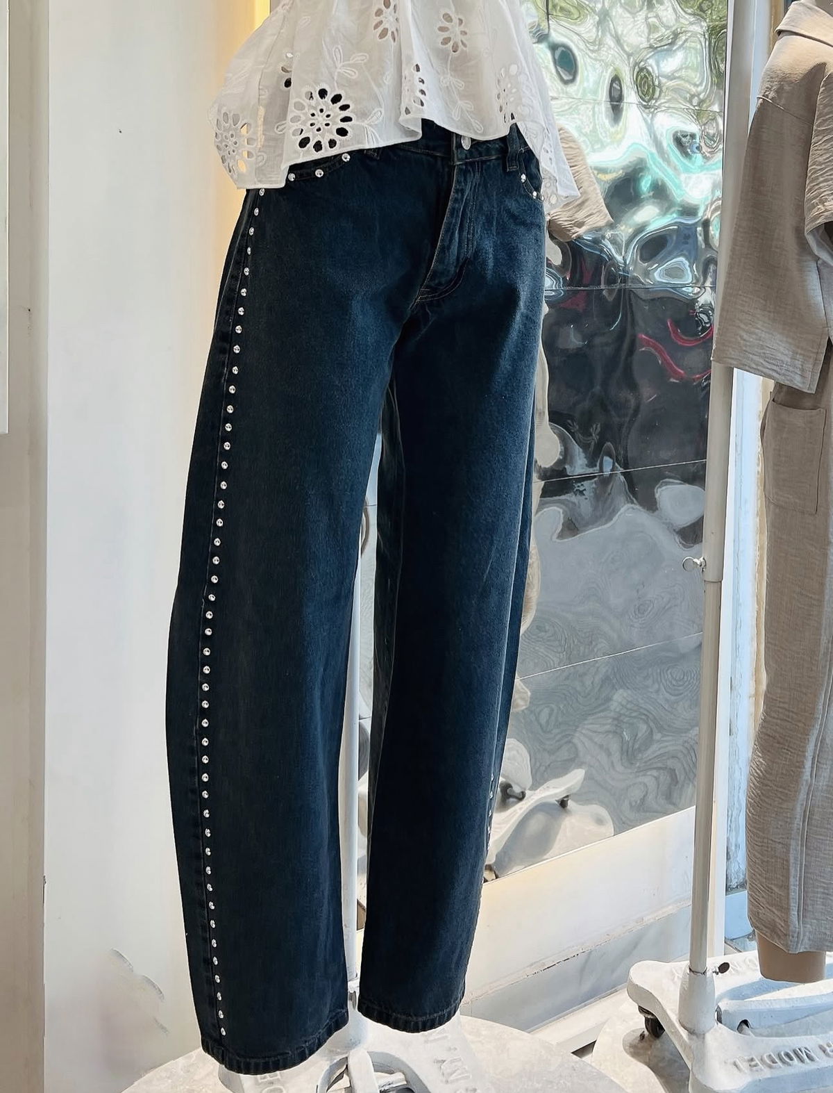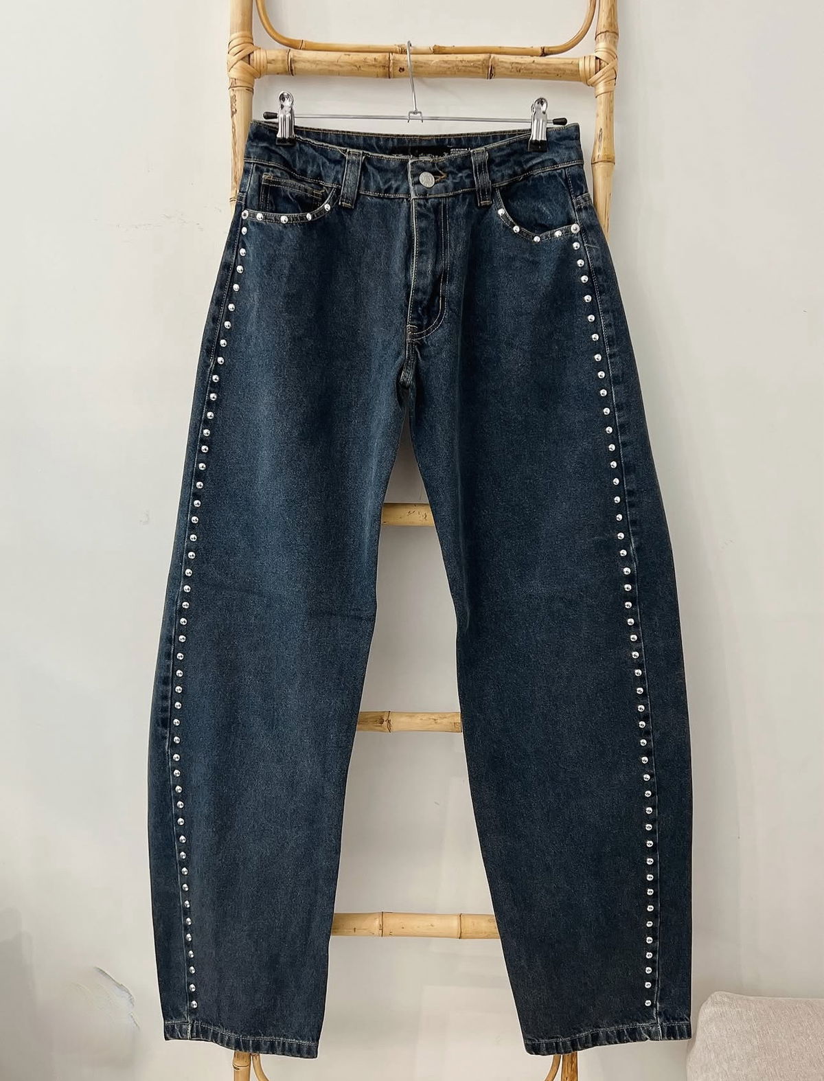 Jean rígido balloon, tiro medio. Tachas a los costados, súper mecha canchero! El talle es bastante amplio, recomendamos llevarte el que usas siempre!