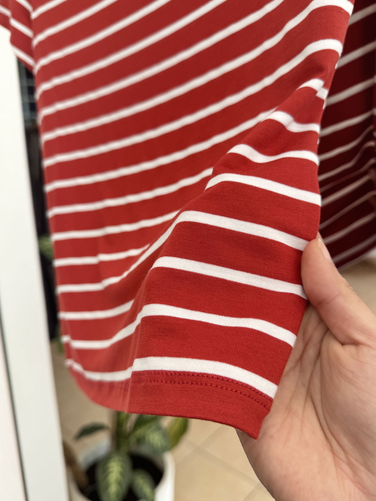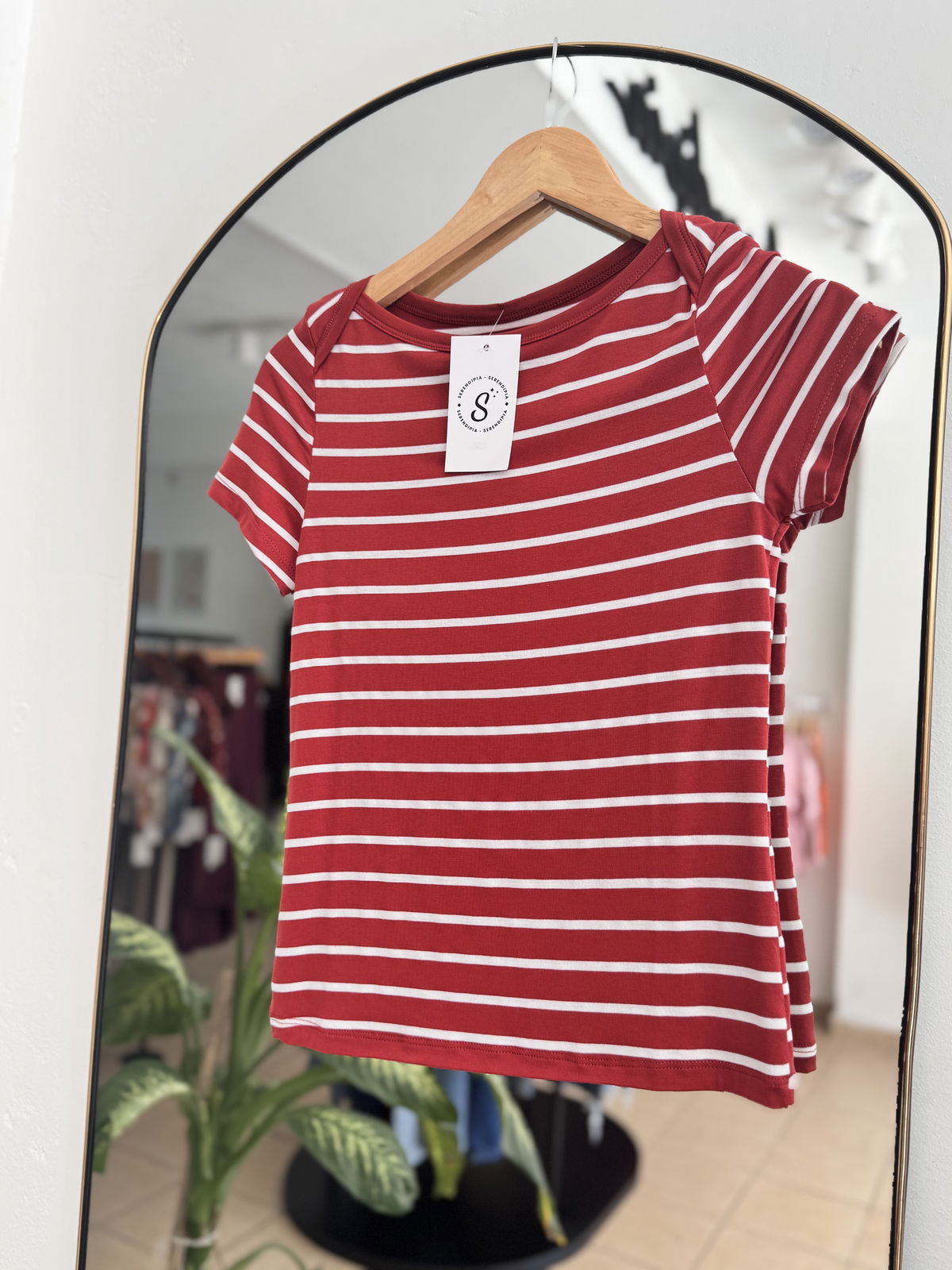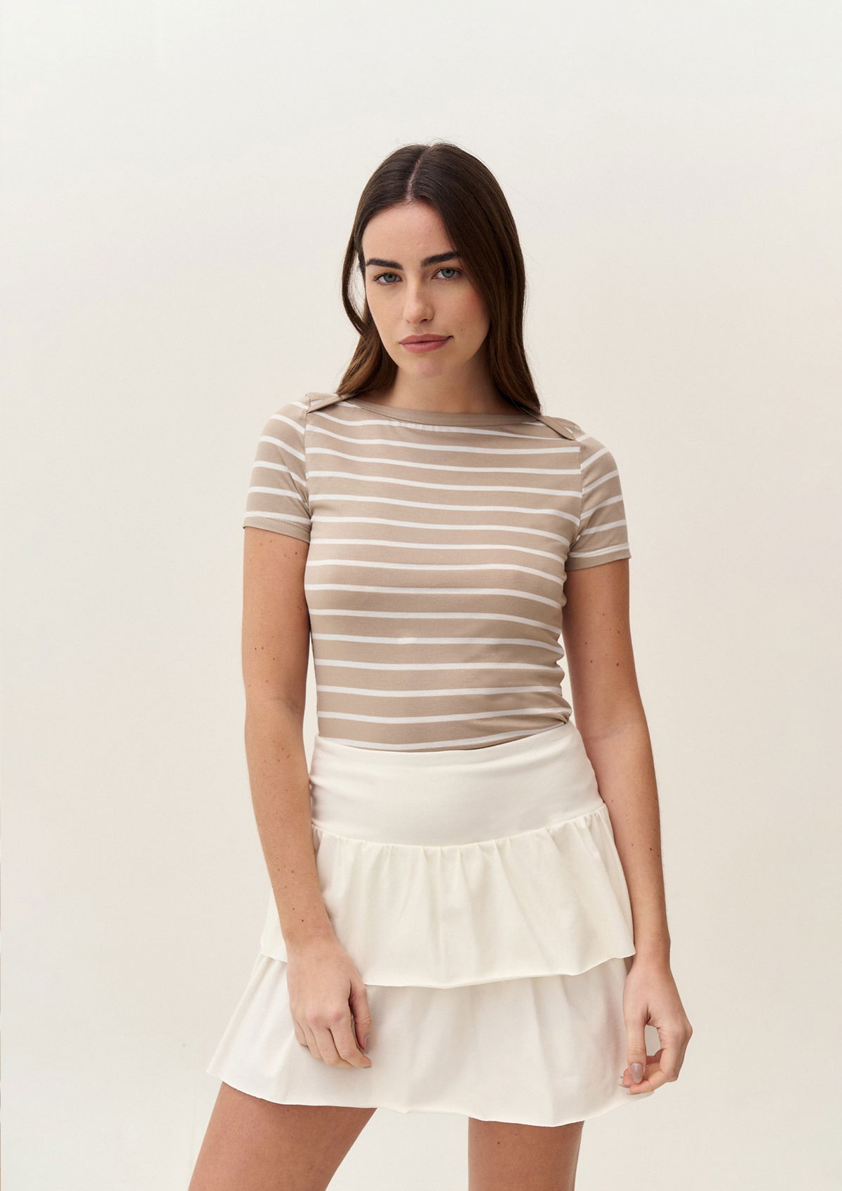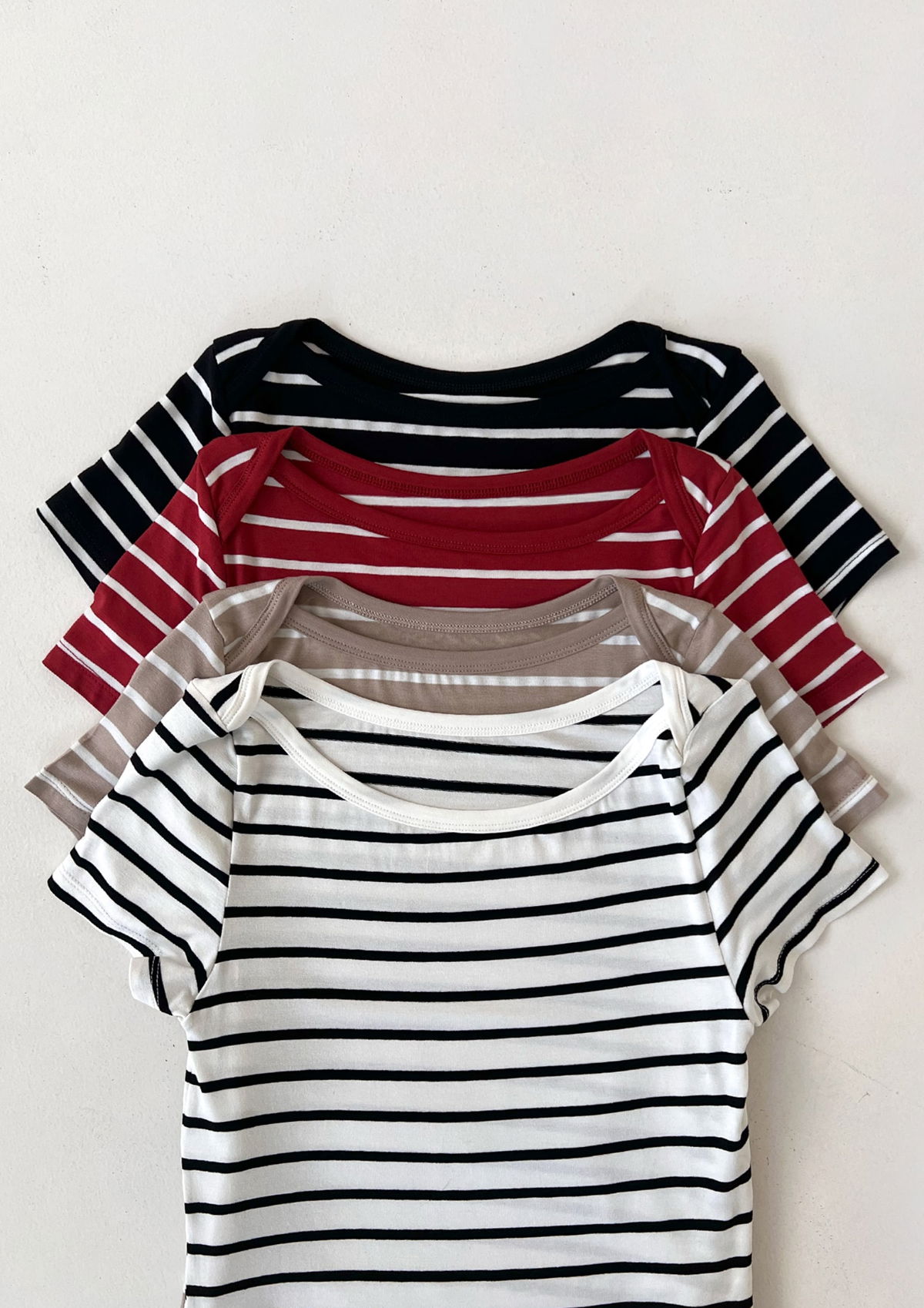 REMERA RAYADA MANGA CORTA CON ESCOTE BOTE SUPERPUESTO, LA TELA ES ELASTIZADA PERO AL CUERPO