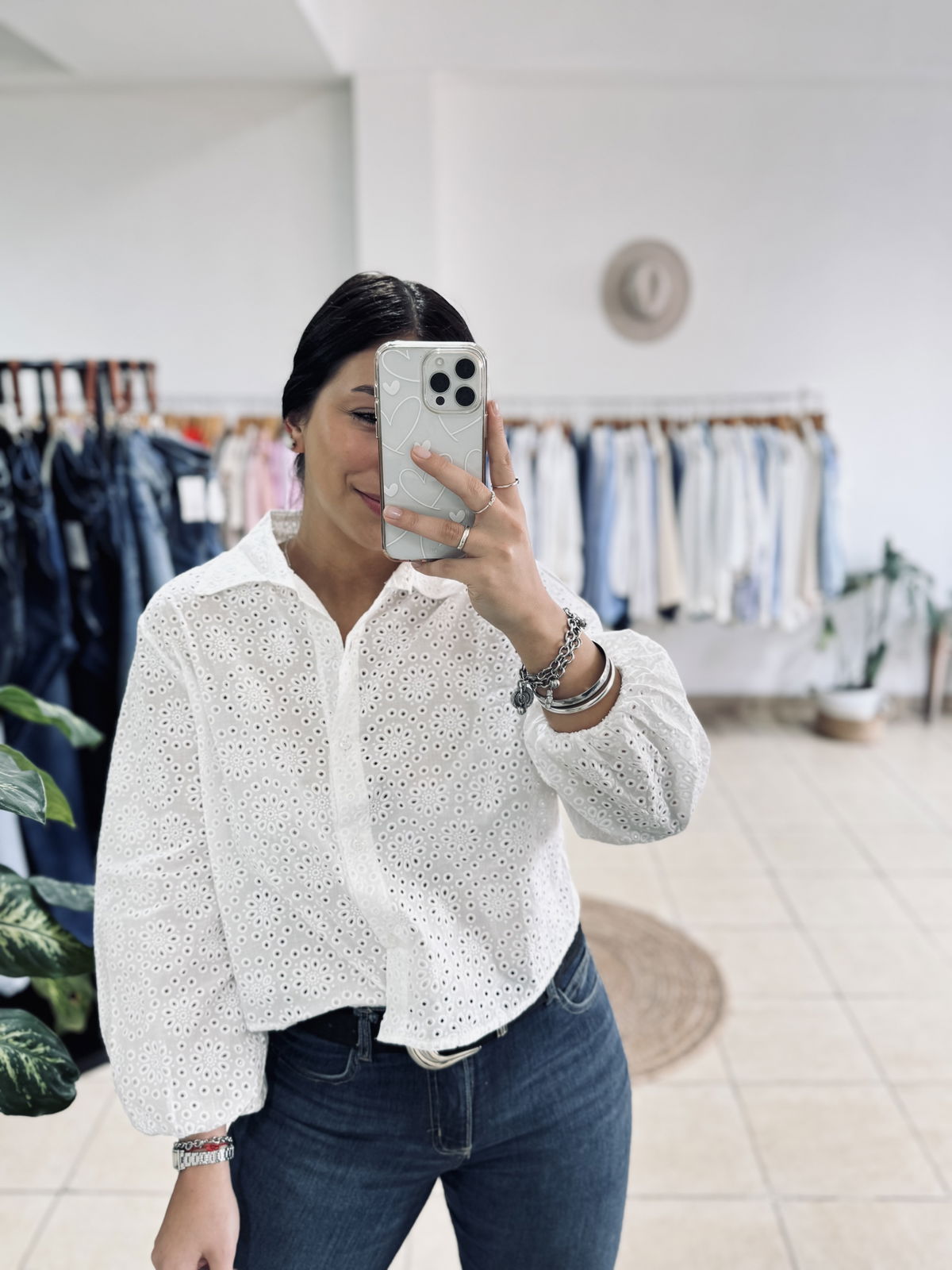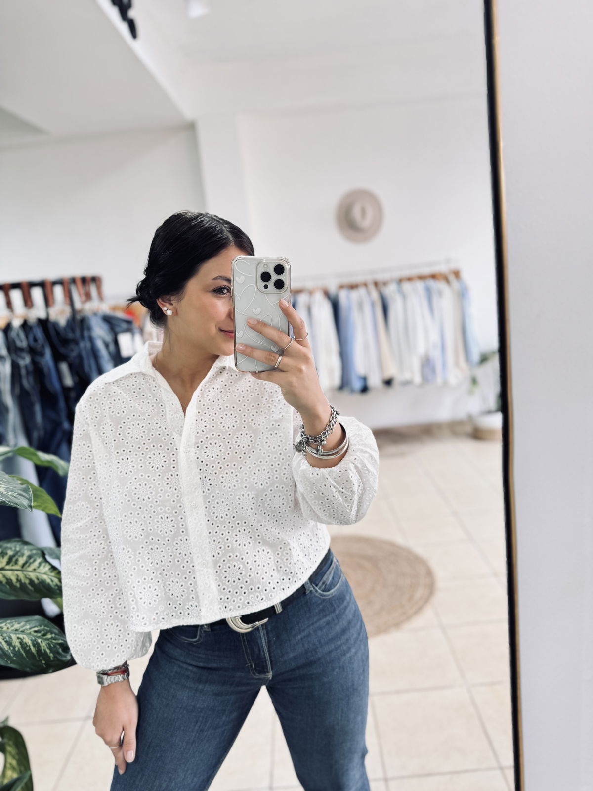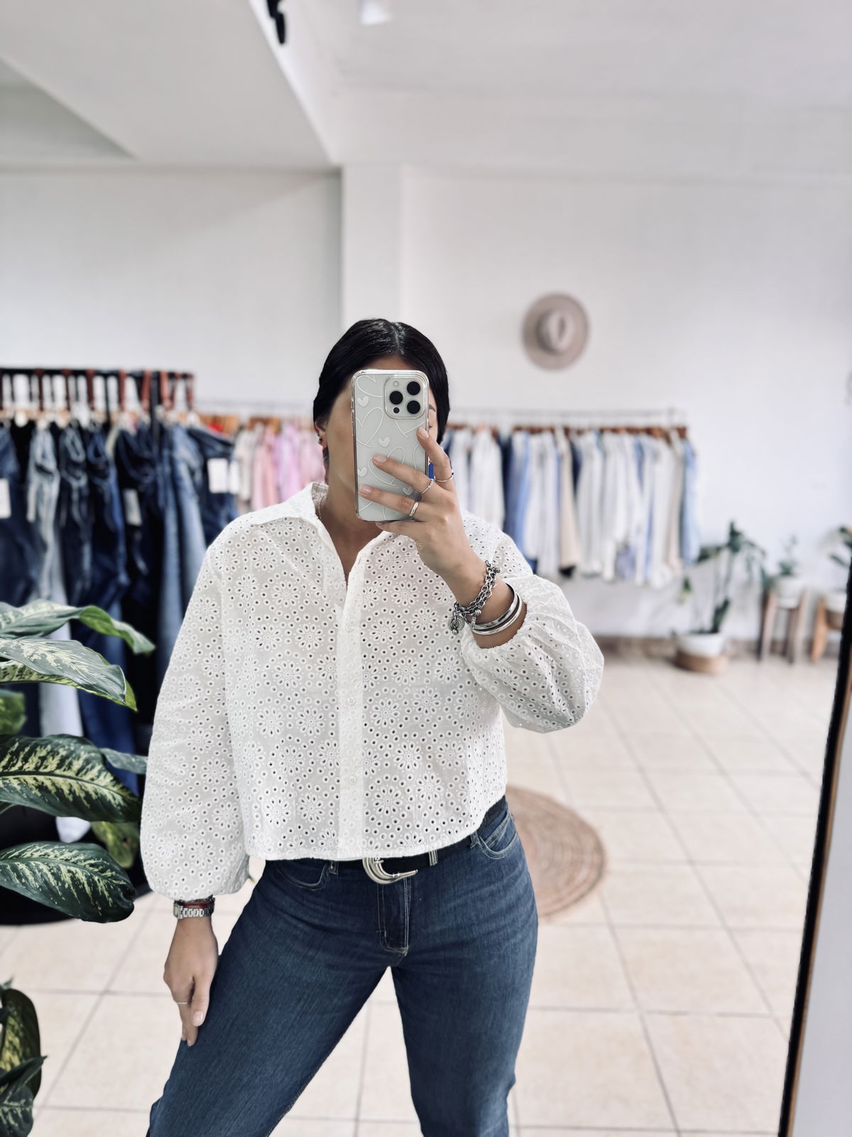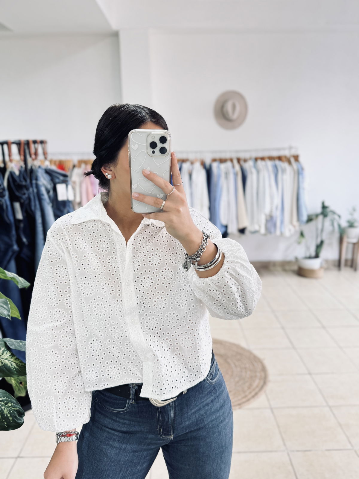Camisa de broderie corta con frunce en puño. Fina, fresca y hermosa por donde la mires