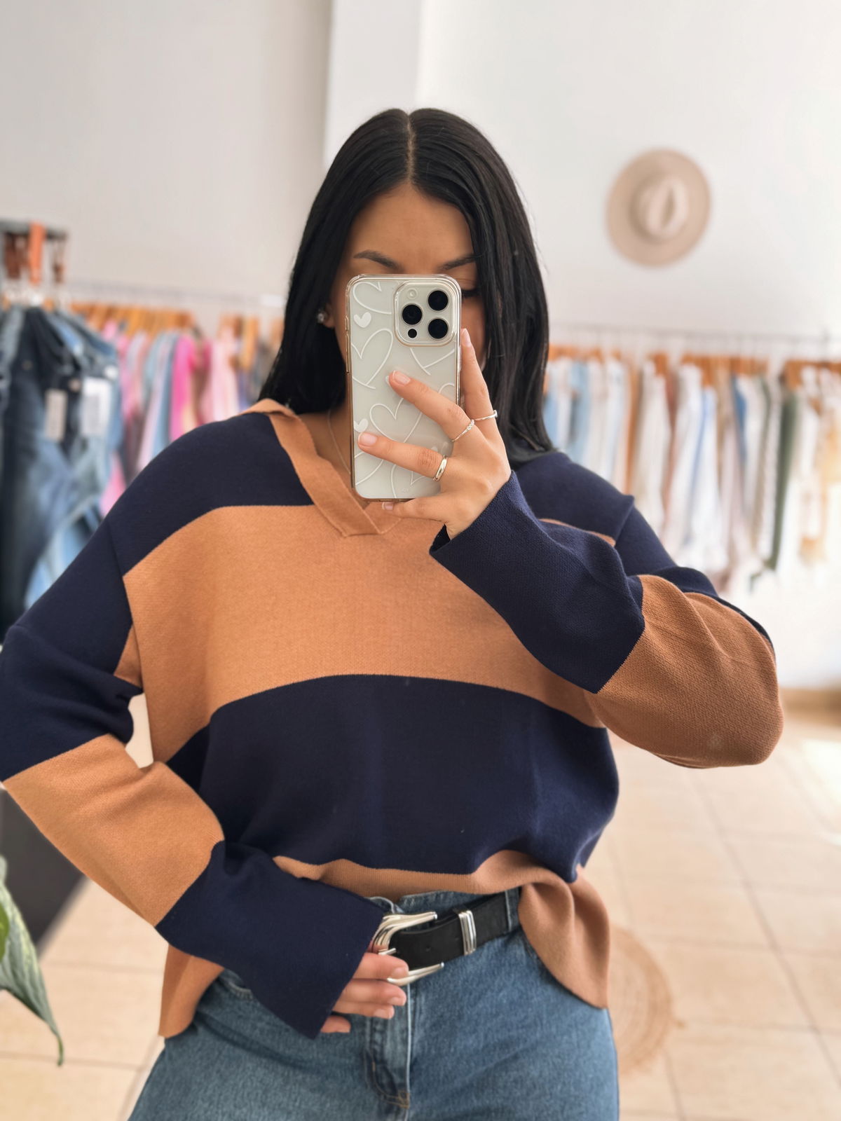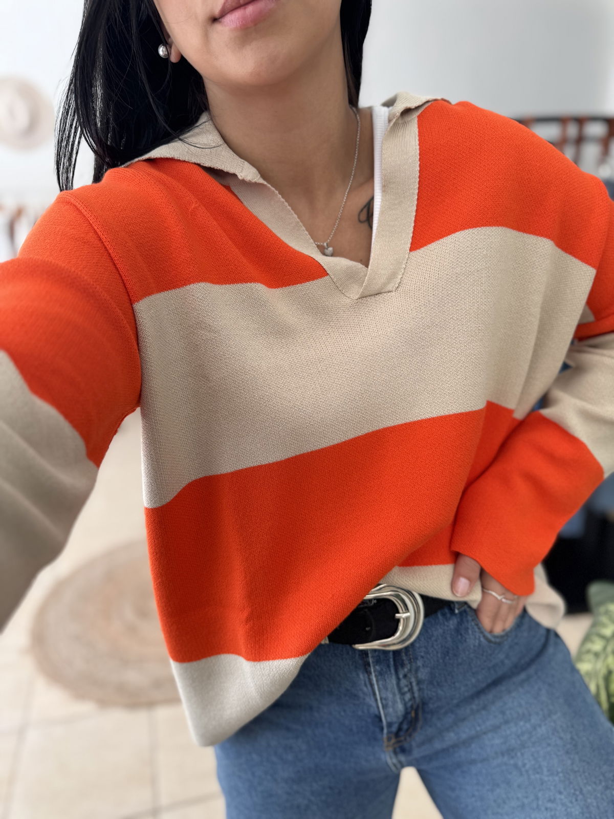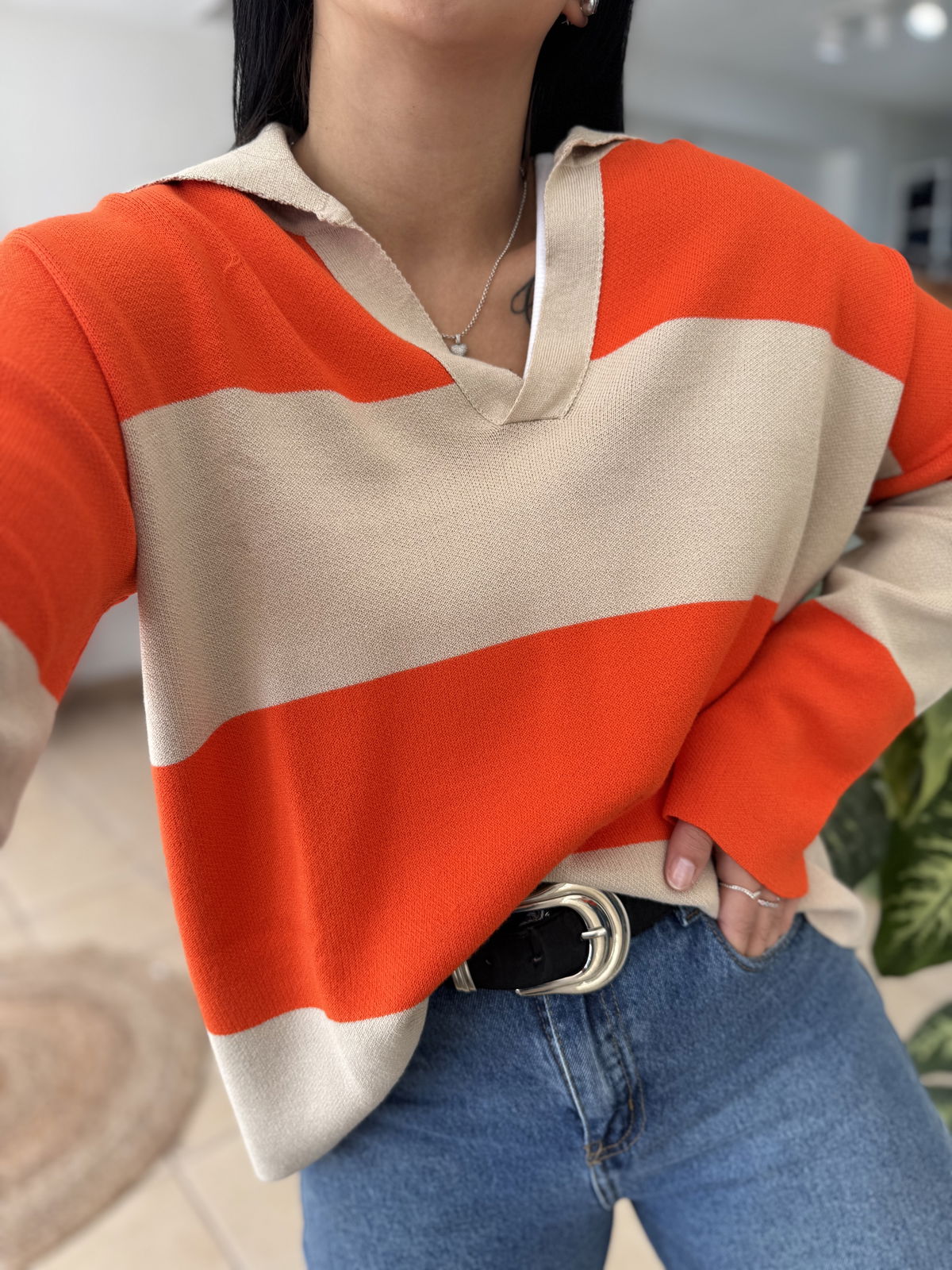 Sweater hilo premium, cuello polo. El modelo es amplio, va hasta un talle 4