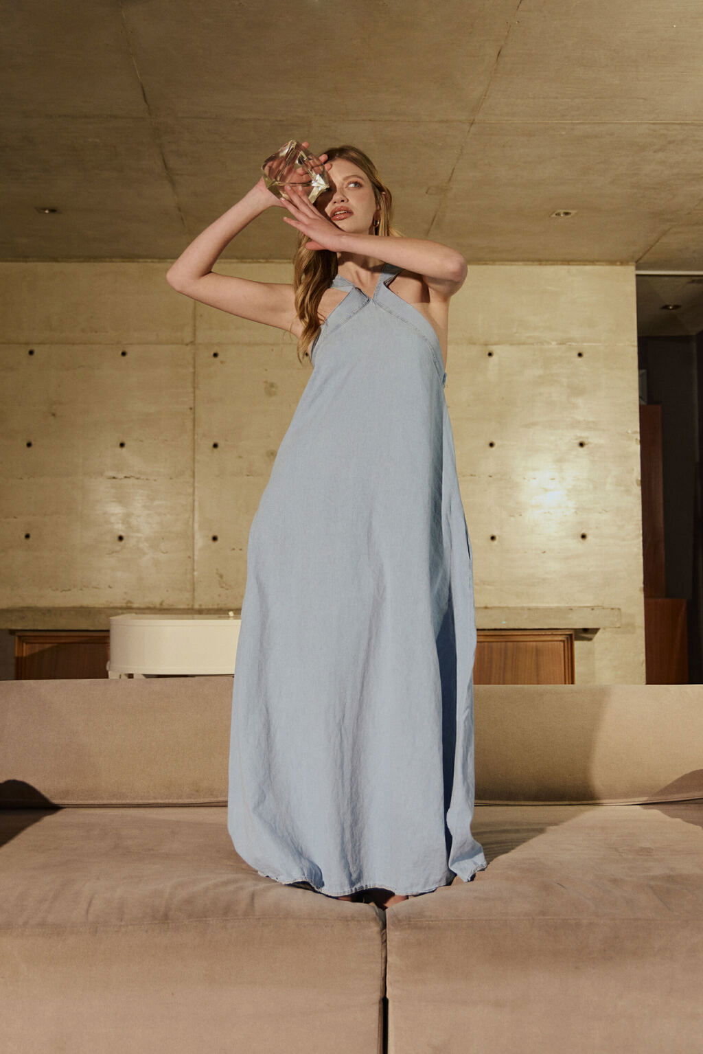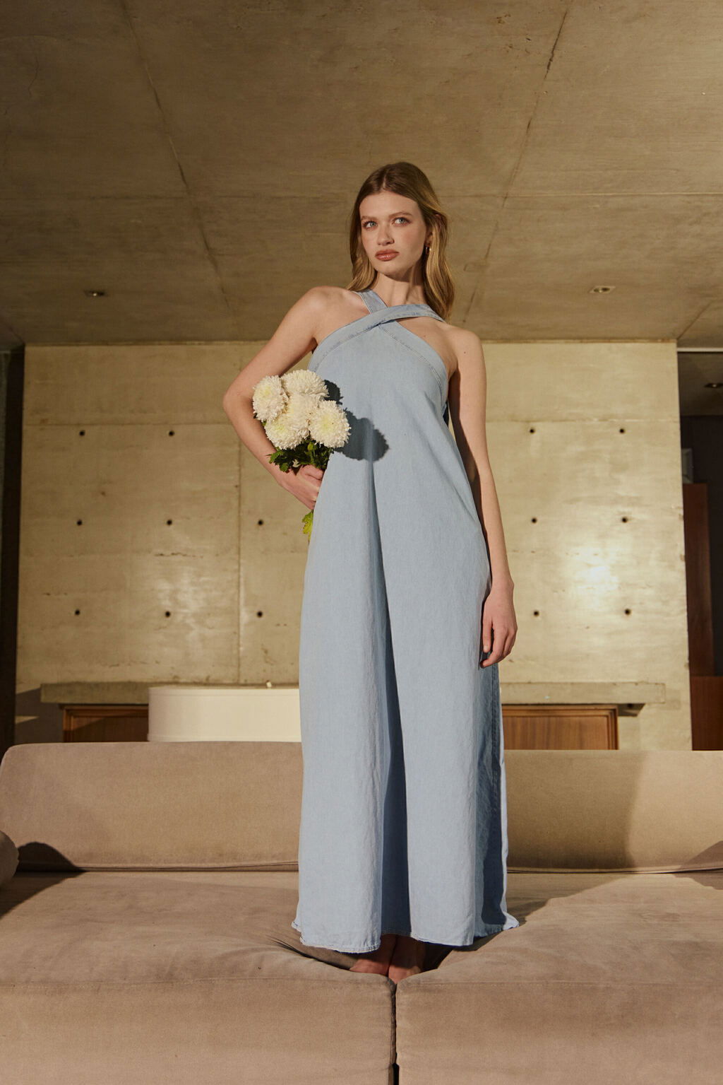 Vestido denim con escote en cruzado y espalda ajustable con medialunas de acero. Bolsillos a los costados