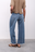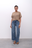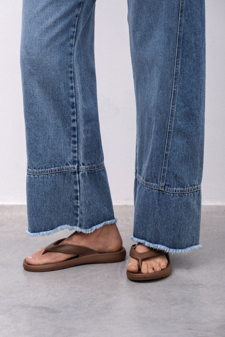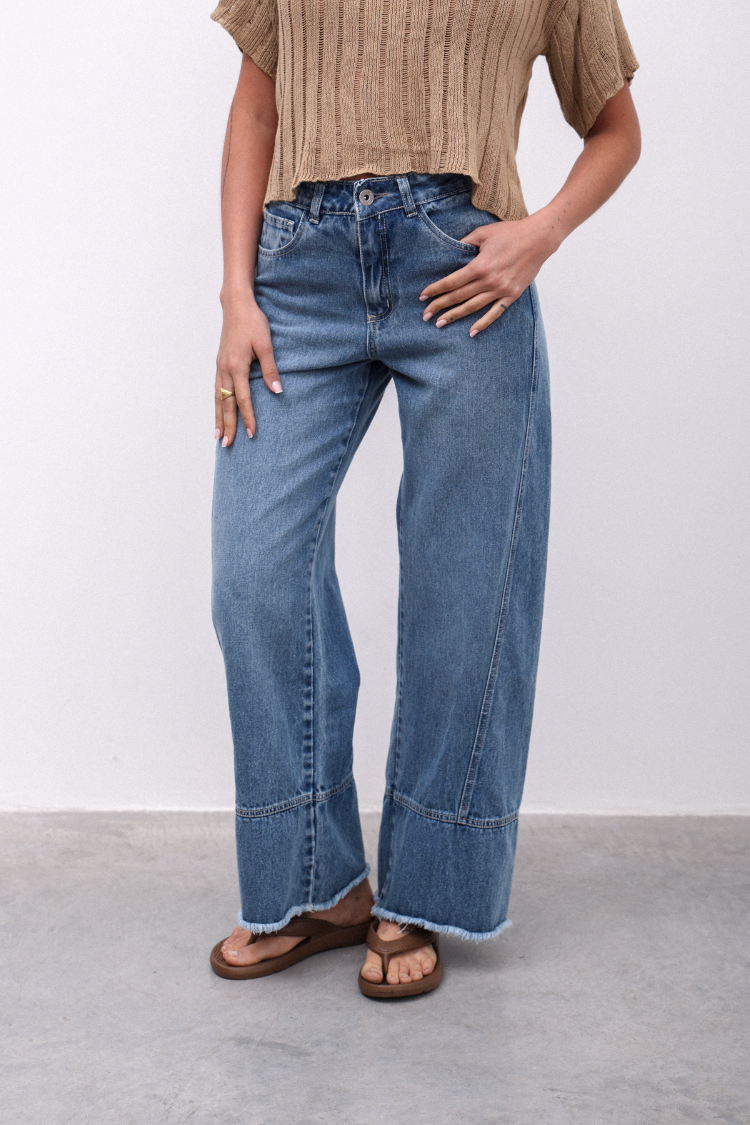 Jean rígido calce wide leg. Es tiro medio que calza debajo del ombligo, color azul bien gastado con localizado suave. El detalle especial de este modelo son sus recortes. Las costuras son color marfil, los avíos níquel viejo y el ruedo es desflecado
