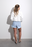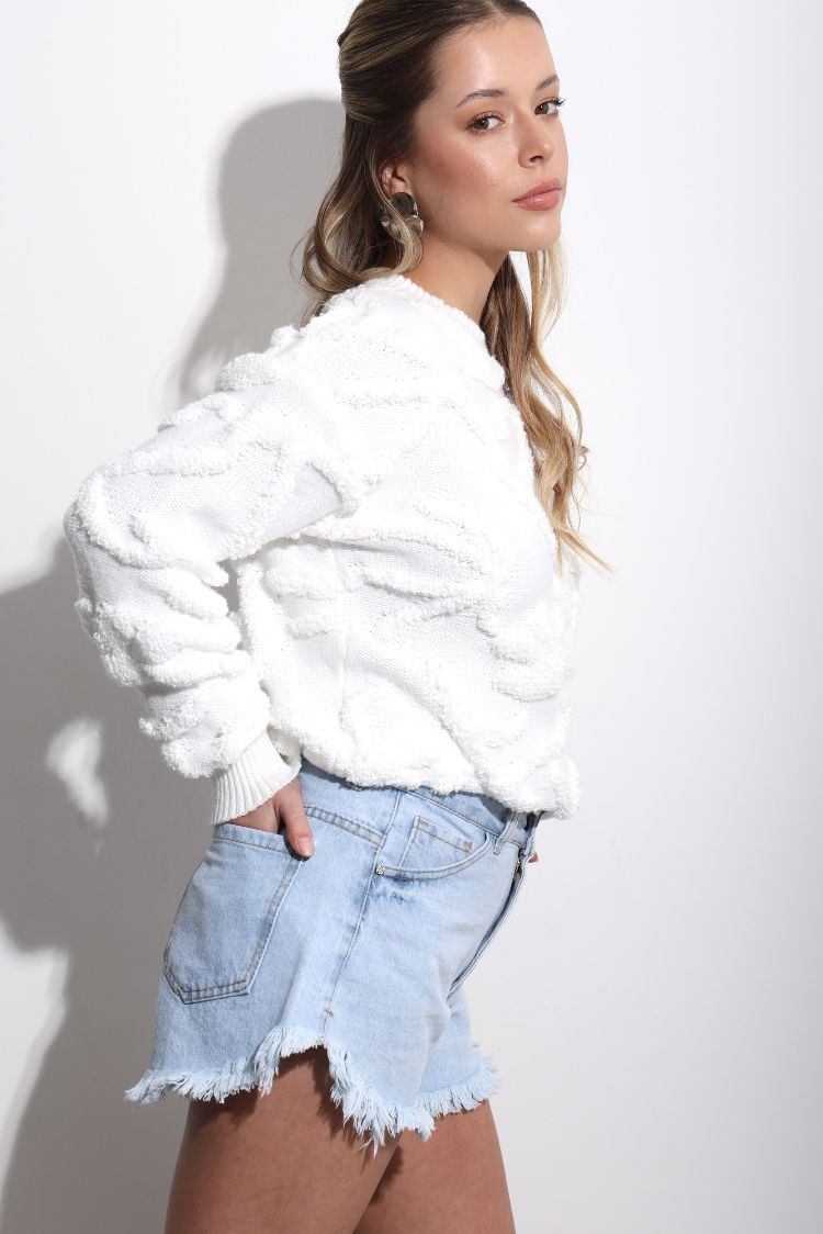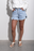 Short de denim rígido, calce regular. Es tiro alto, tiene ruedo desflecado largo y lavado en tono celeste con bigotes y nevado suave que resalta la textura y los contrastes. Las costuras son color camel y los avíos níquel brillante.