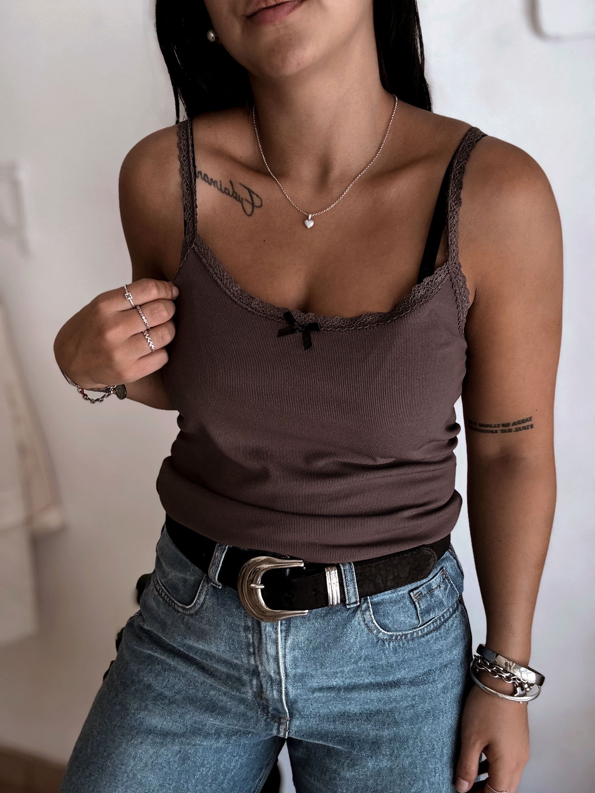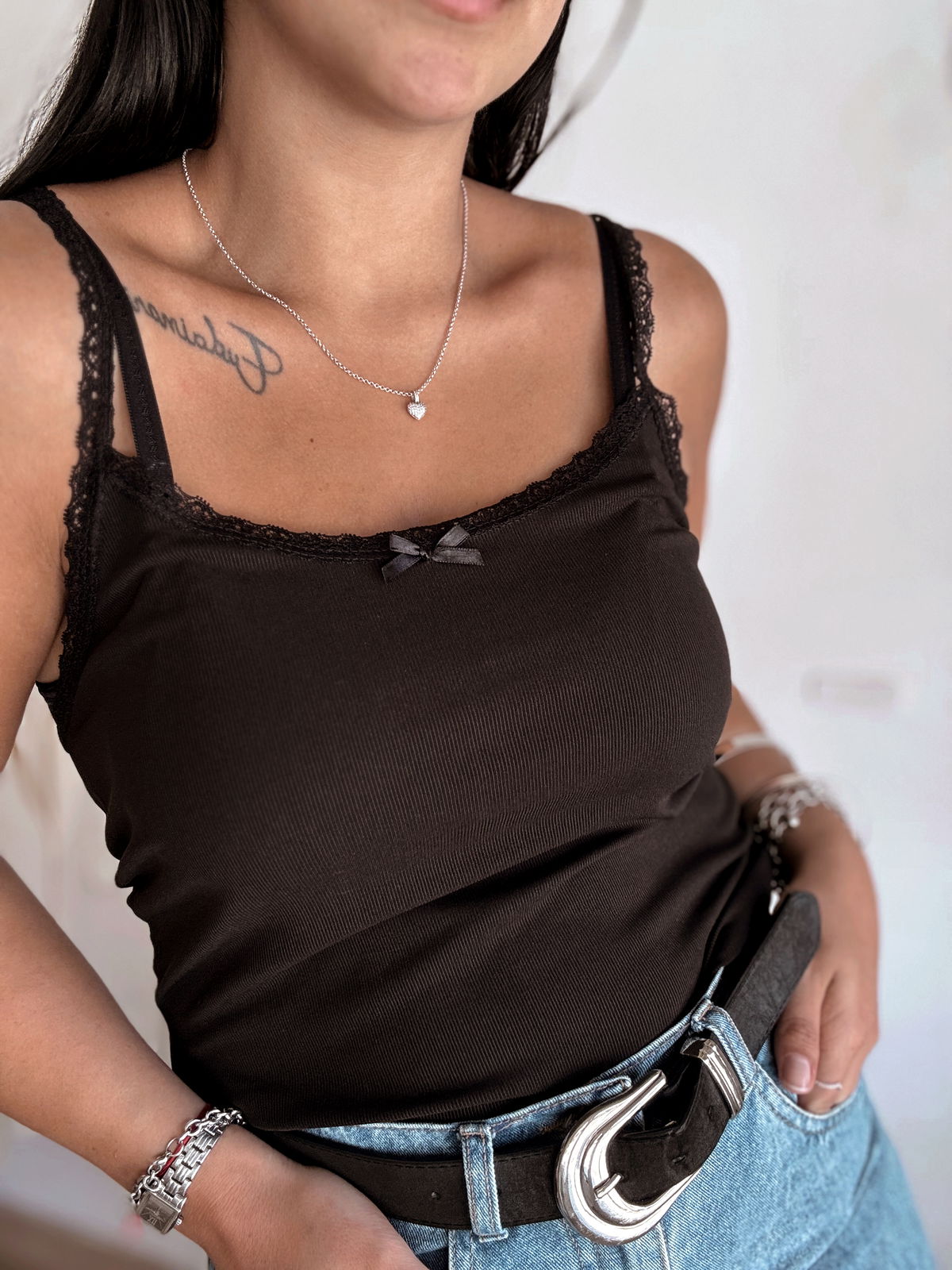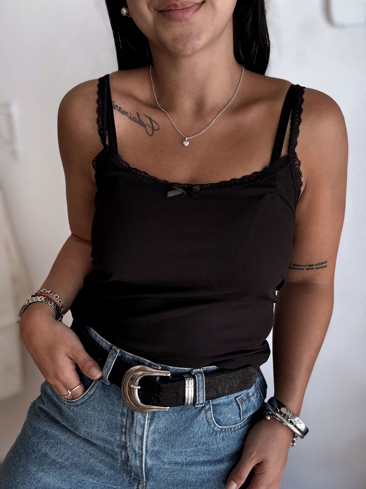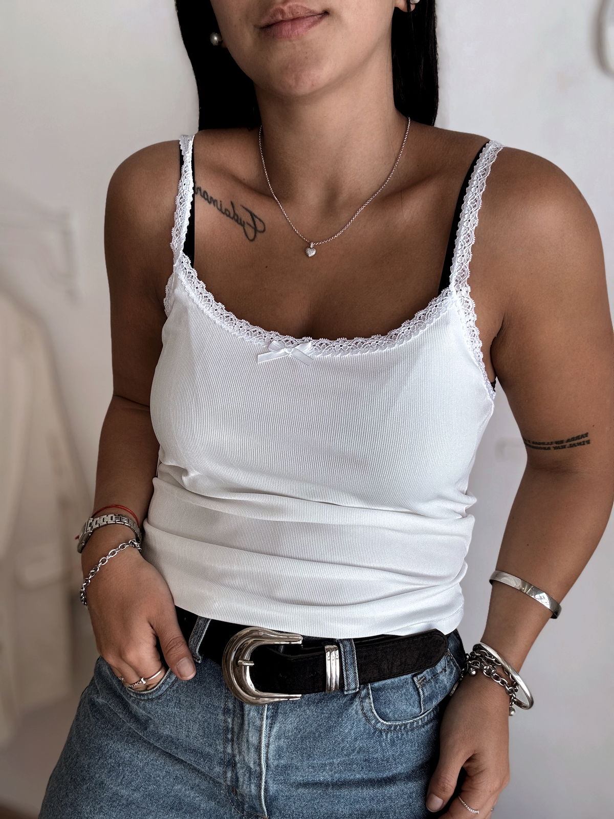 Musculosa de Morley rib, con puntilla y pequeño moñito en busto. Talle único, abarca hasta un L