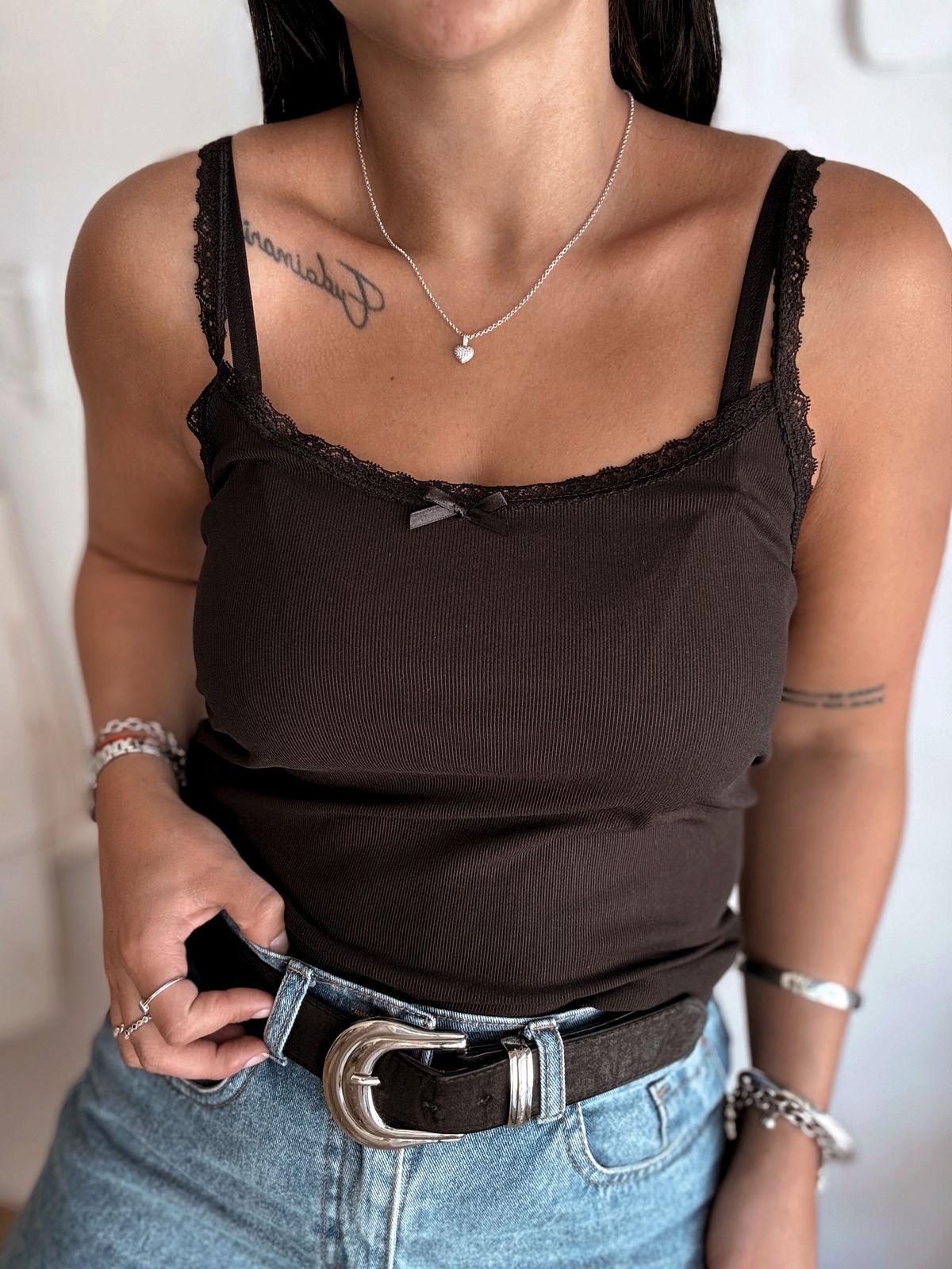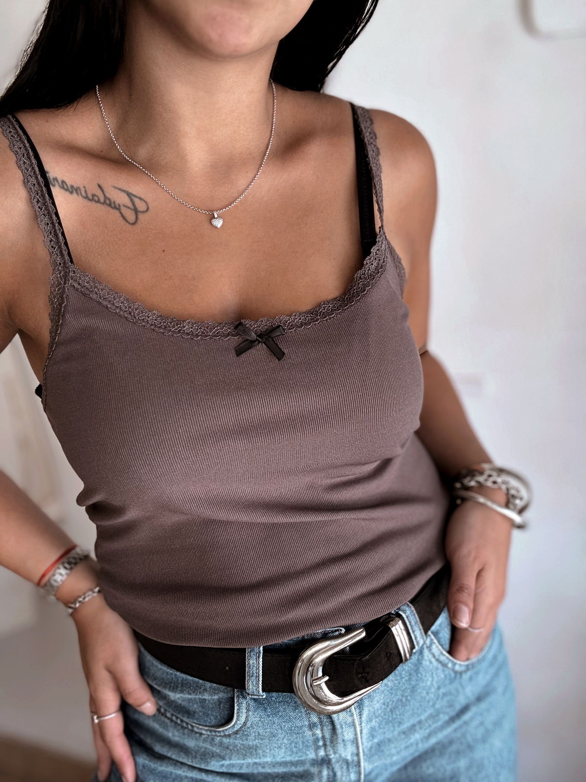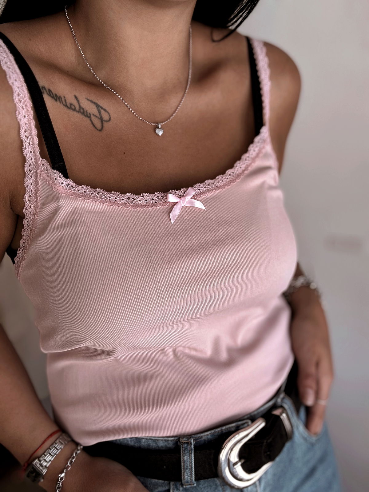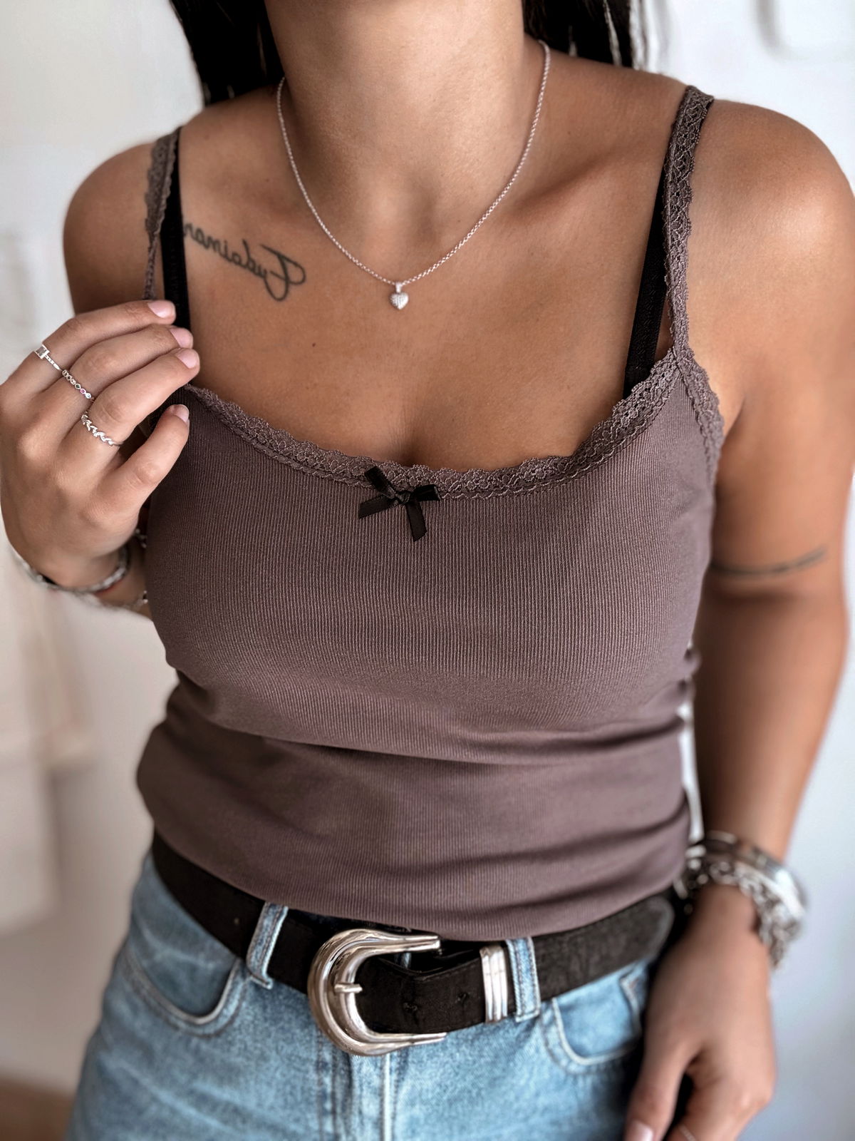 Musculosa de Morley rib, con puntilla y pequeño moñito en busto. Talle único, abarca hasta un L