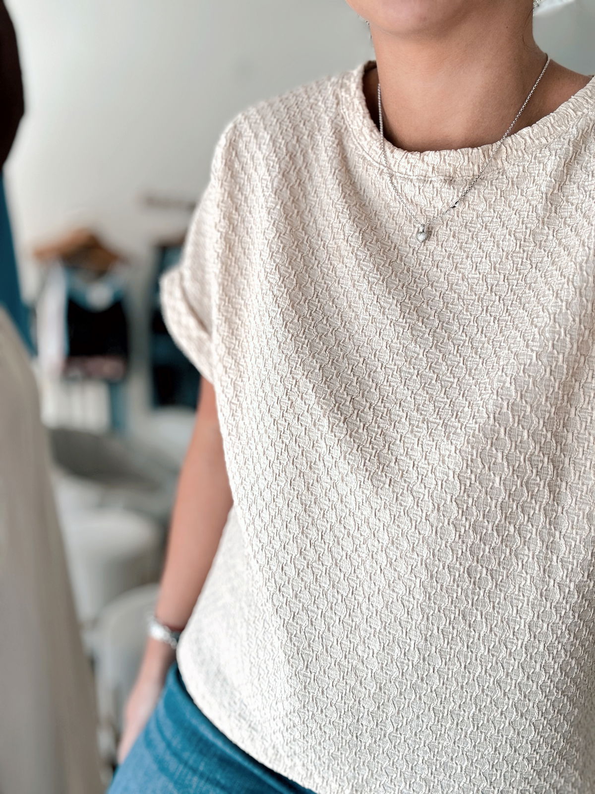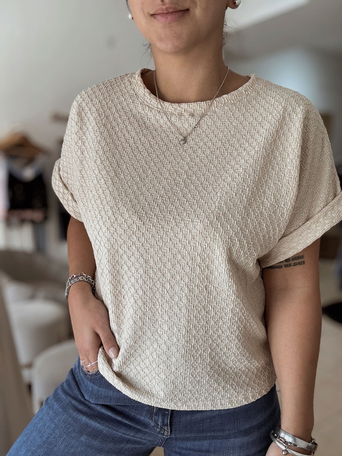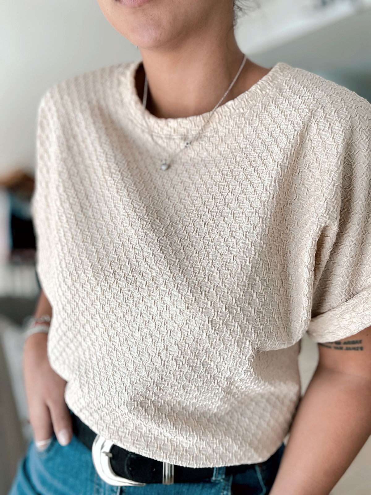 Remera Cleo HAWAII TRAMADO: un tejido tramado suave, caída recta y un toque tropical que eleva cualquier outfit de temporada. Ideal para combinar con denim o faldas ligeras para un look cómodo y moderno. El talle es único pero amplio, va hasta un 3/4