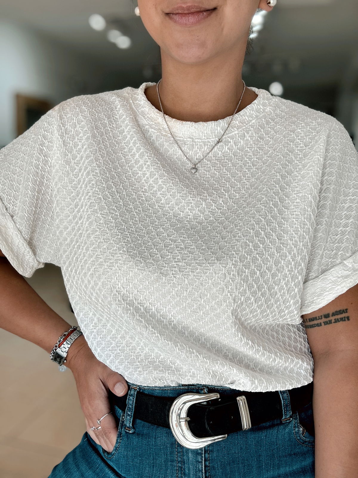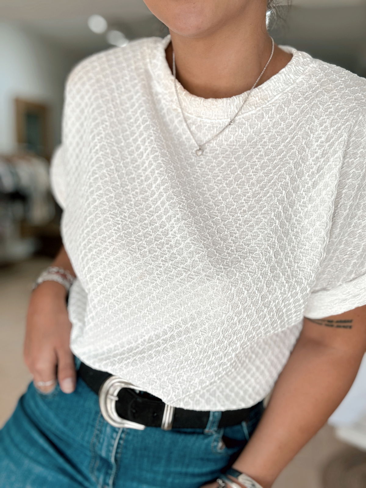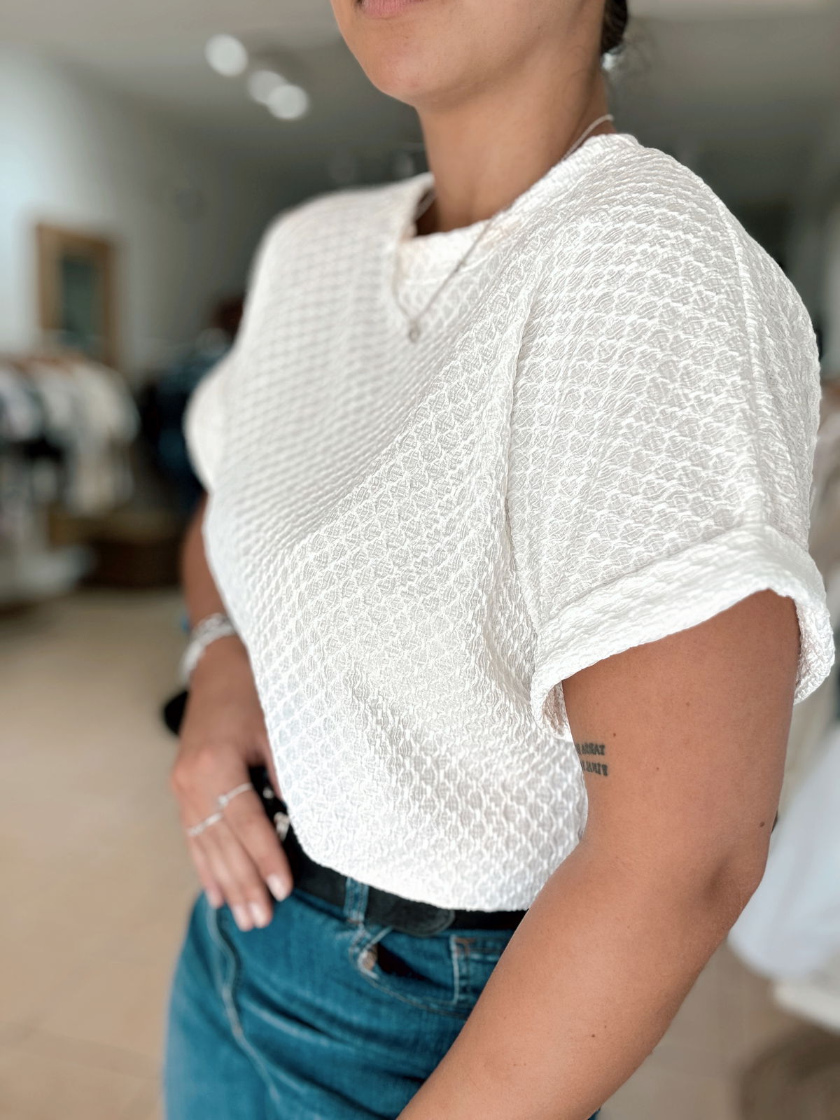 Remera Cleo HAWAII TRAMADO: un tejido tramado suave, caída recta y un toque tropical que eleva cualquier outfit de temporada. Ideal para combinar con denim o faldas ligeras para un look cómodo y moderno. El talle es único pero amplio, va hasta un 3/4