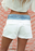 Short rígido combinado con denim en cintura, calce regular. Es tiro alto, color off white con la cintura en celeste gastado. Las costuras son color marfil, los ávios níquel brillante y el ruedo clásico con pulido intenso en terminaciones.