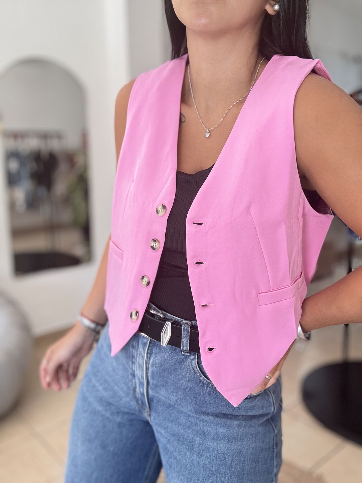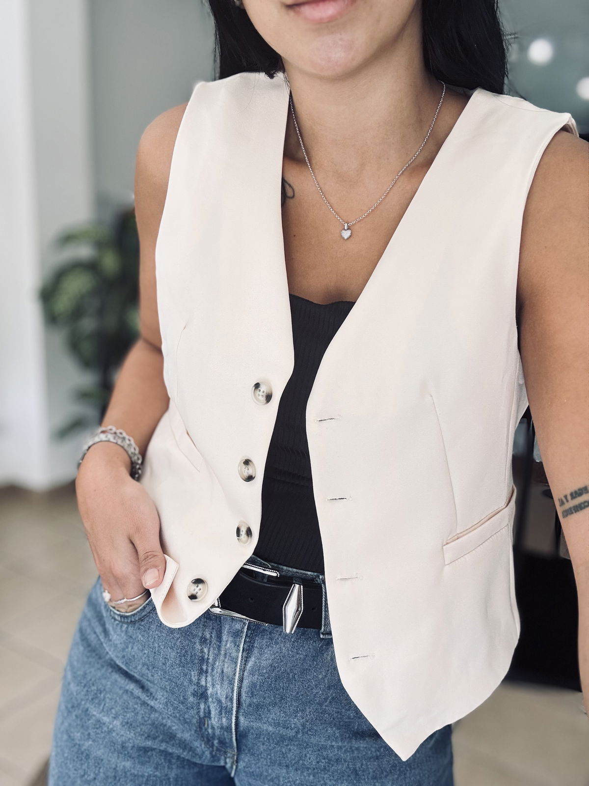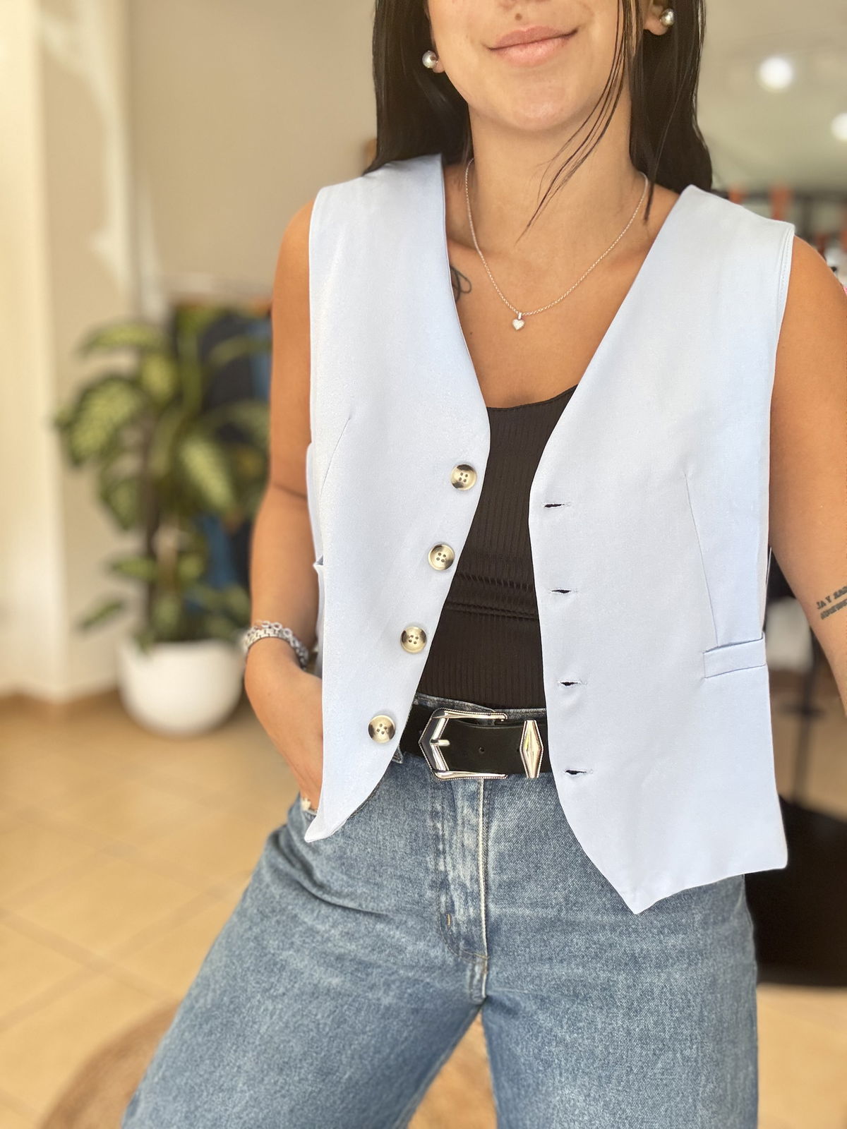Chaleco sastrero corto con forreria interna. talle cumplido! Lau está usando el talle 2 y tiene 95 de busto