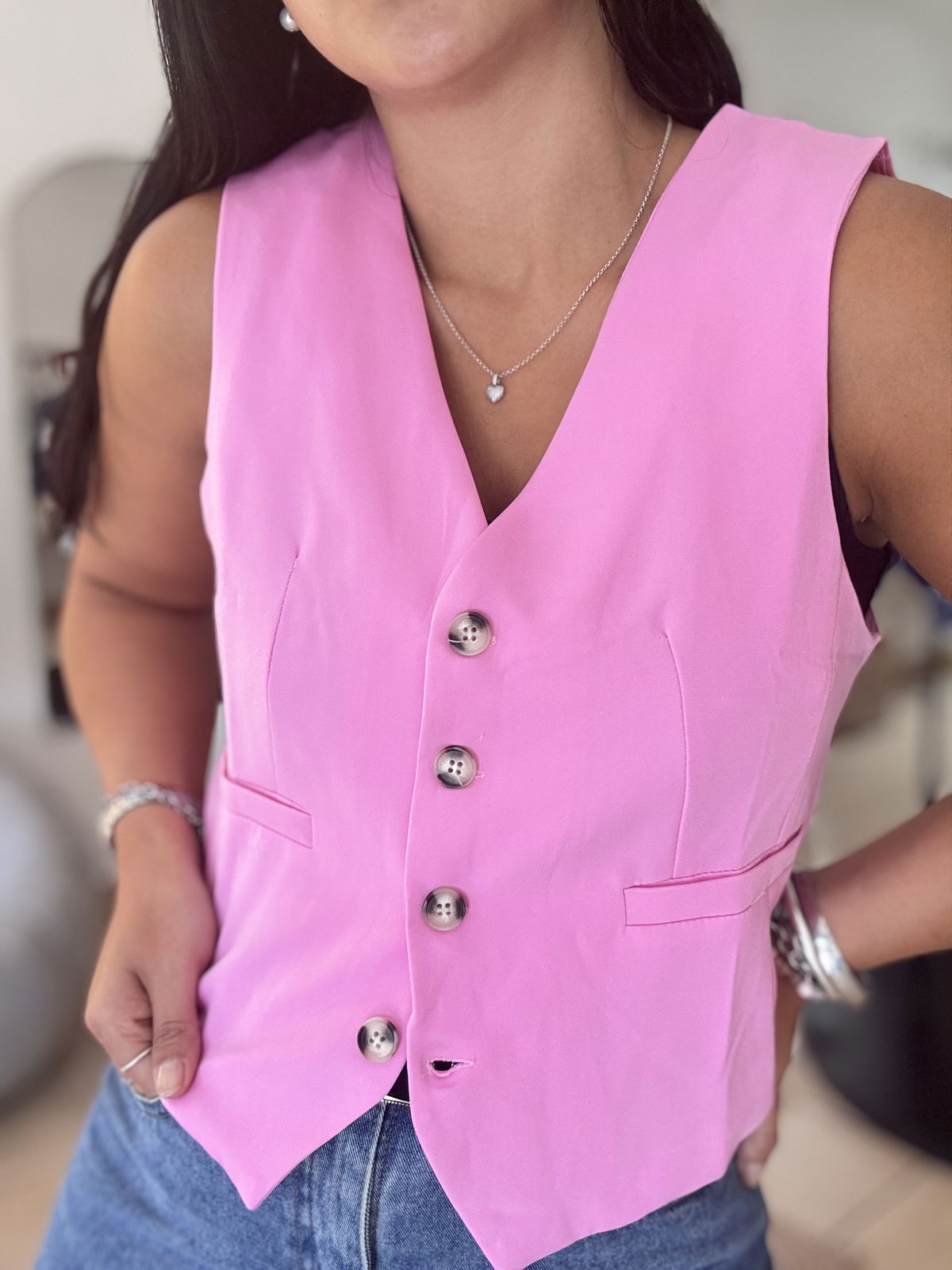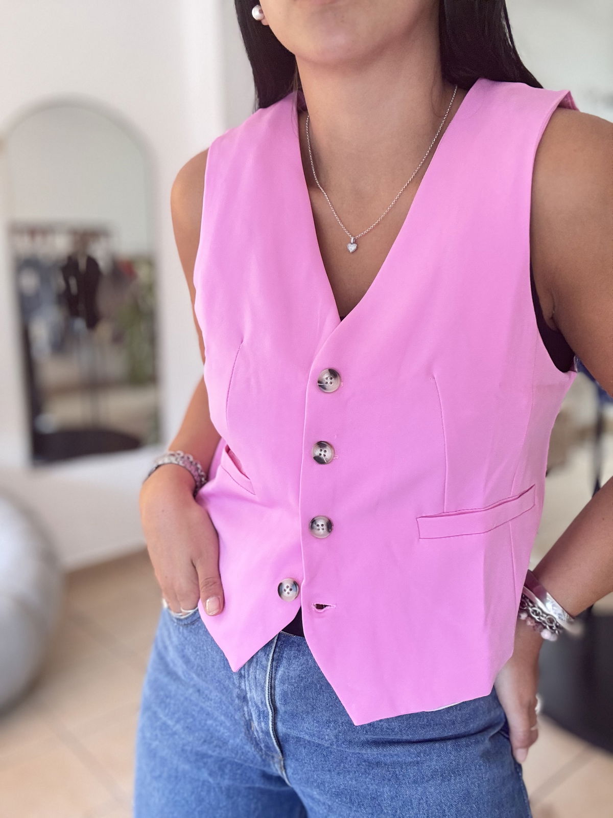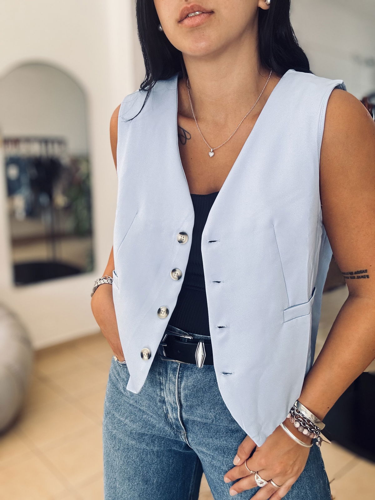 Chaleco sastrero corto con forreria interna. talle cumplido! Lau está usando el talle 2 y tiene 95 de busto