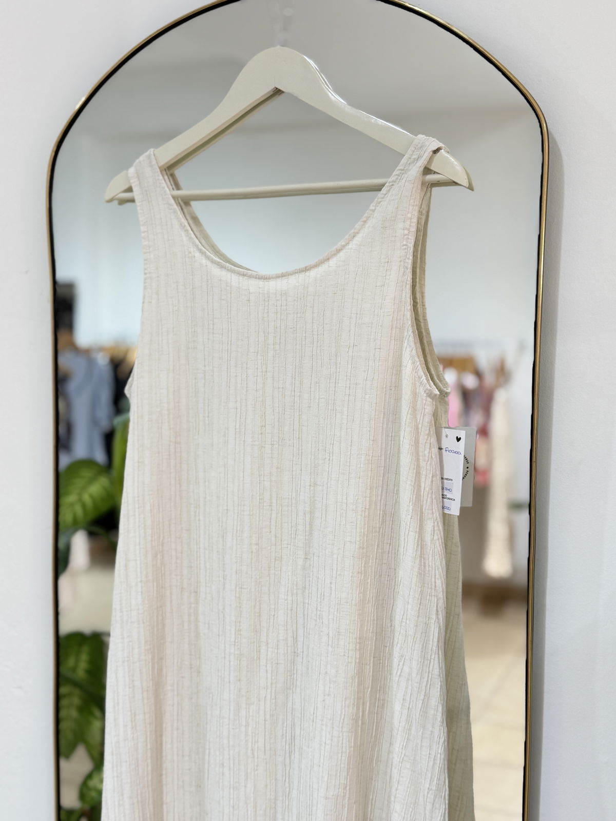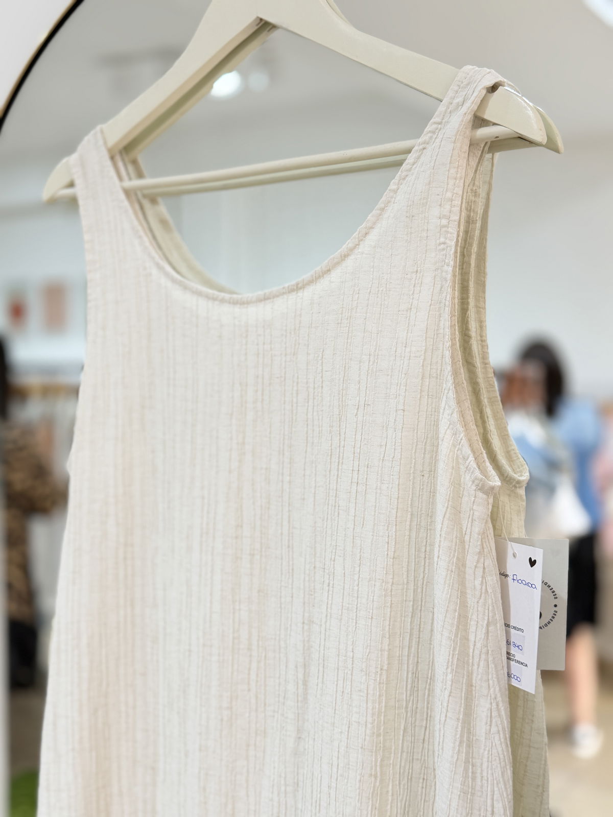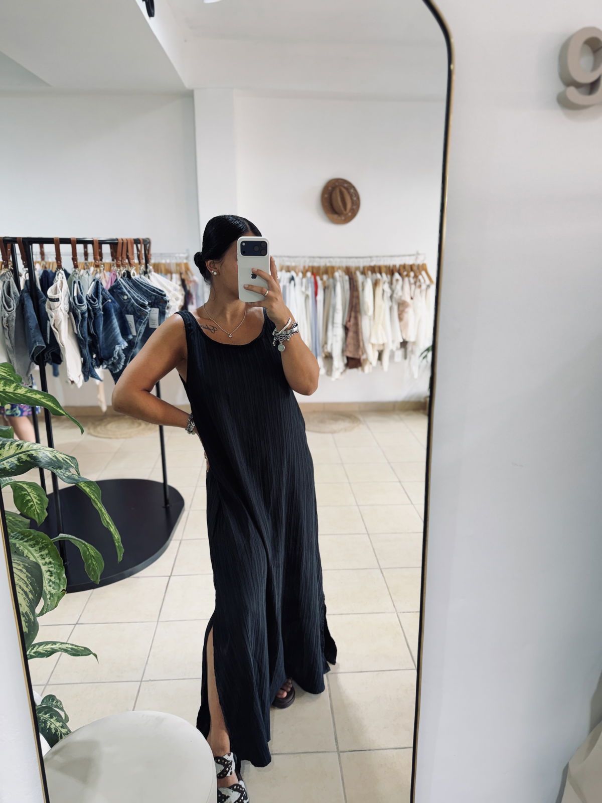 Vestido de cotón con textura, largo. espalda y cuello en U, con tajo lateral