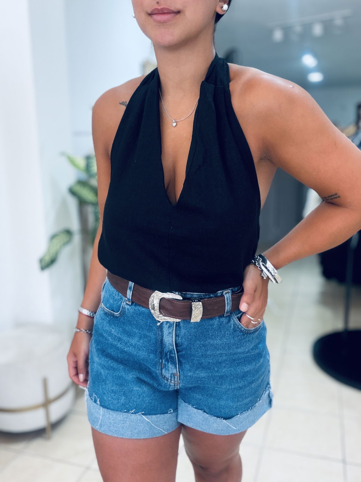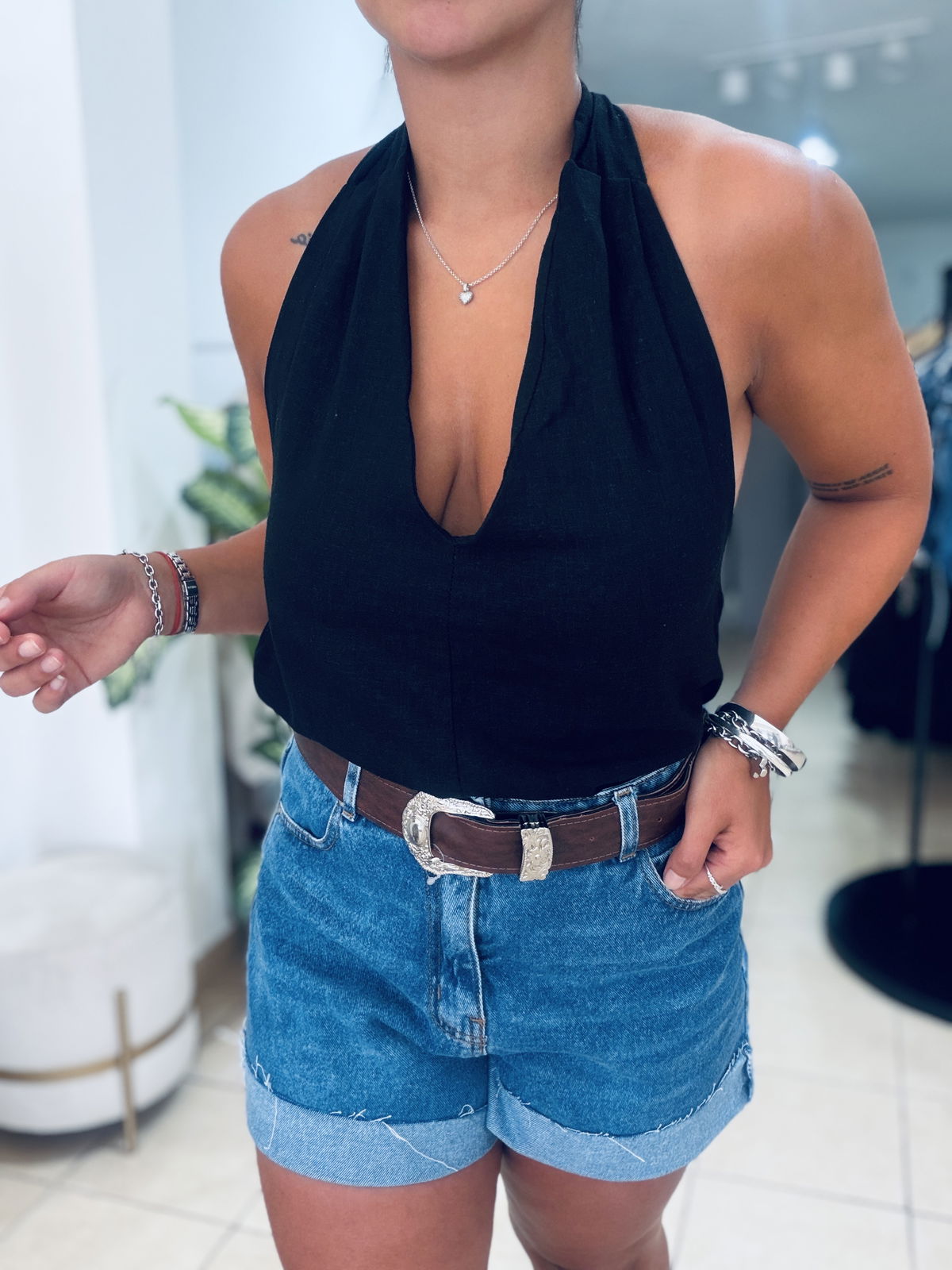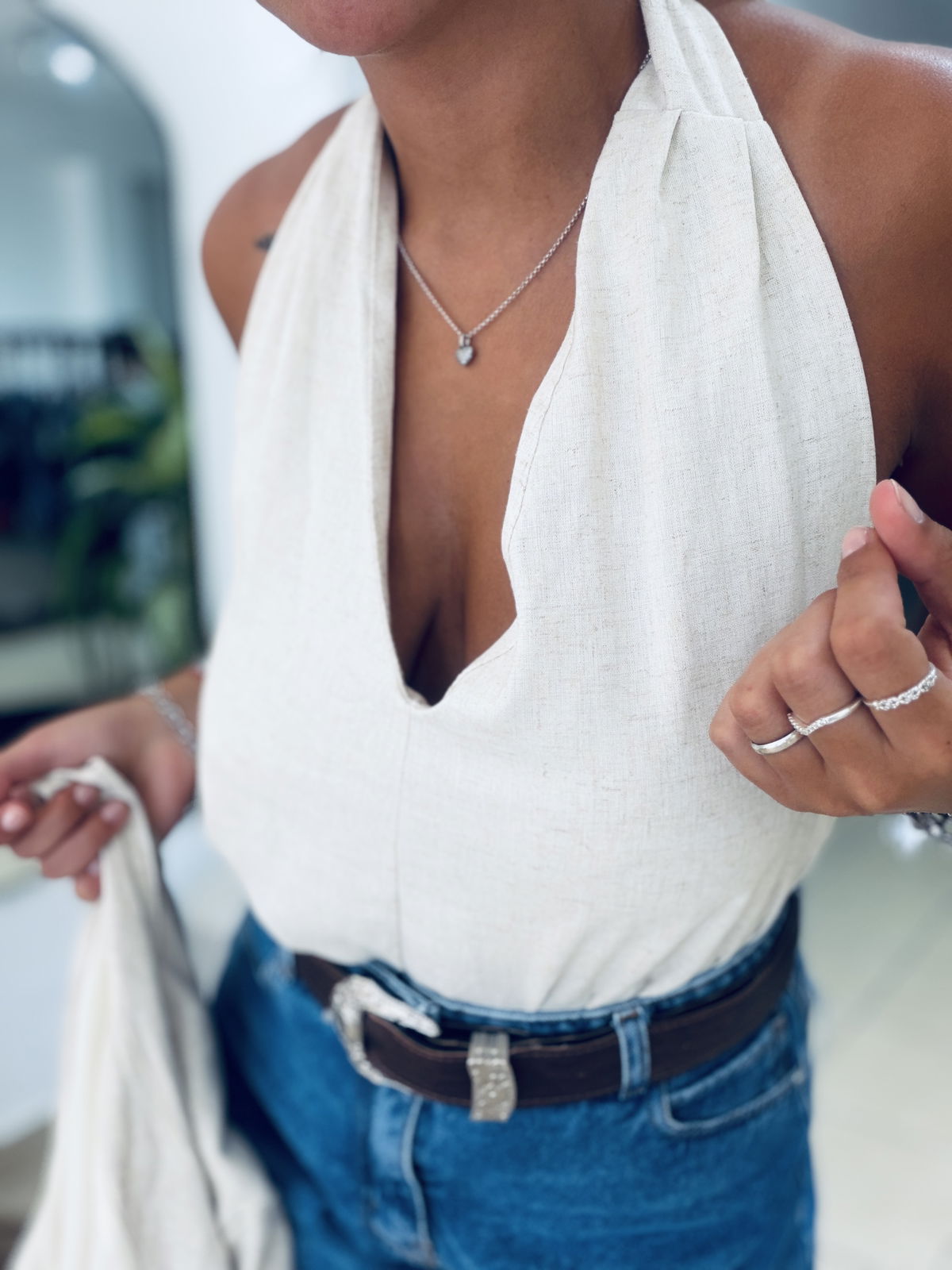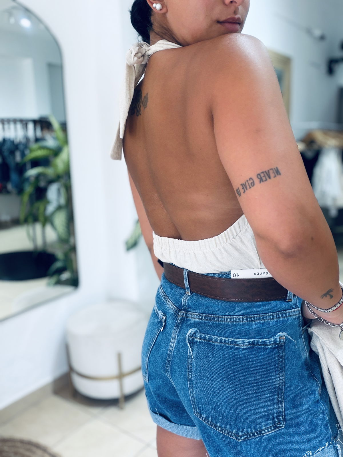 Top de lino con espalda abierta y lazo para atar, sueltita, podés usarla adentro o afuera!