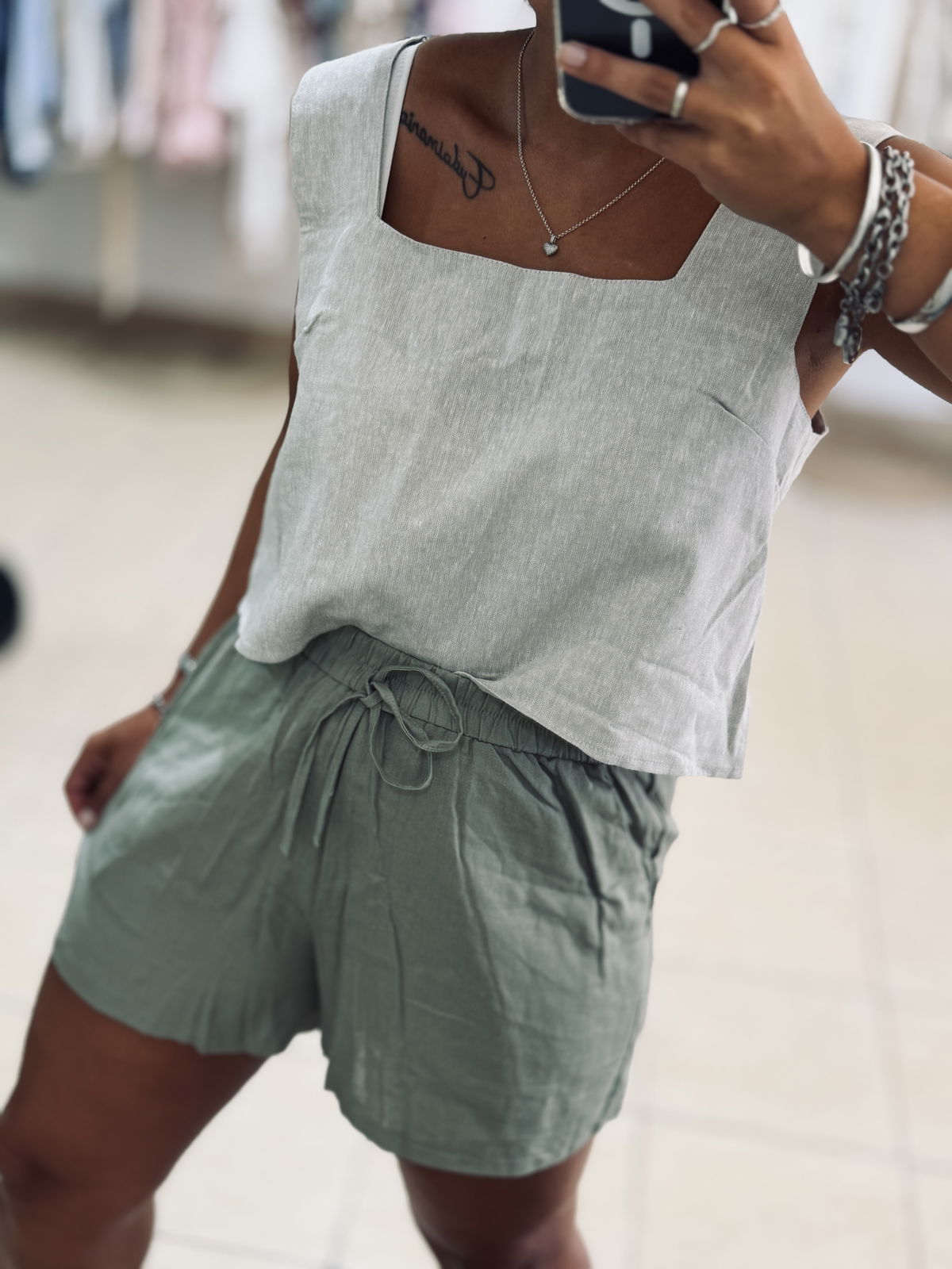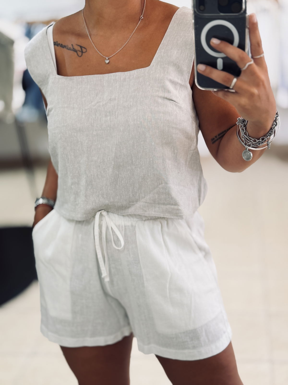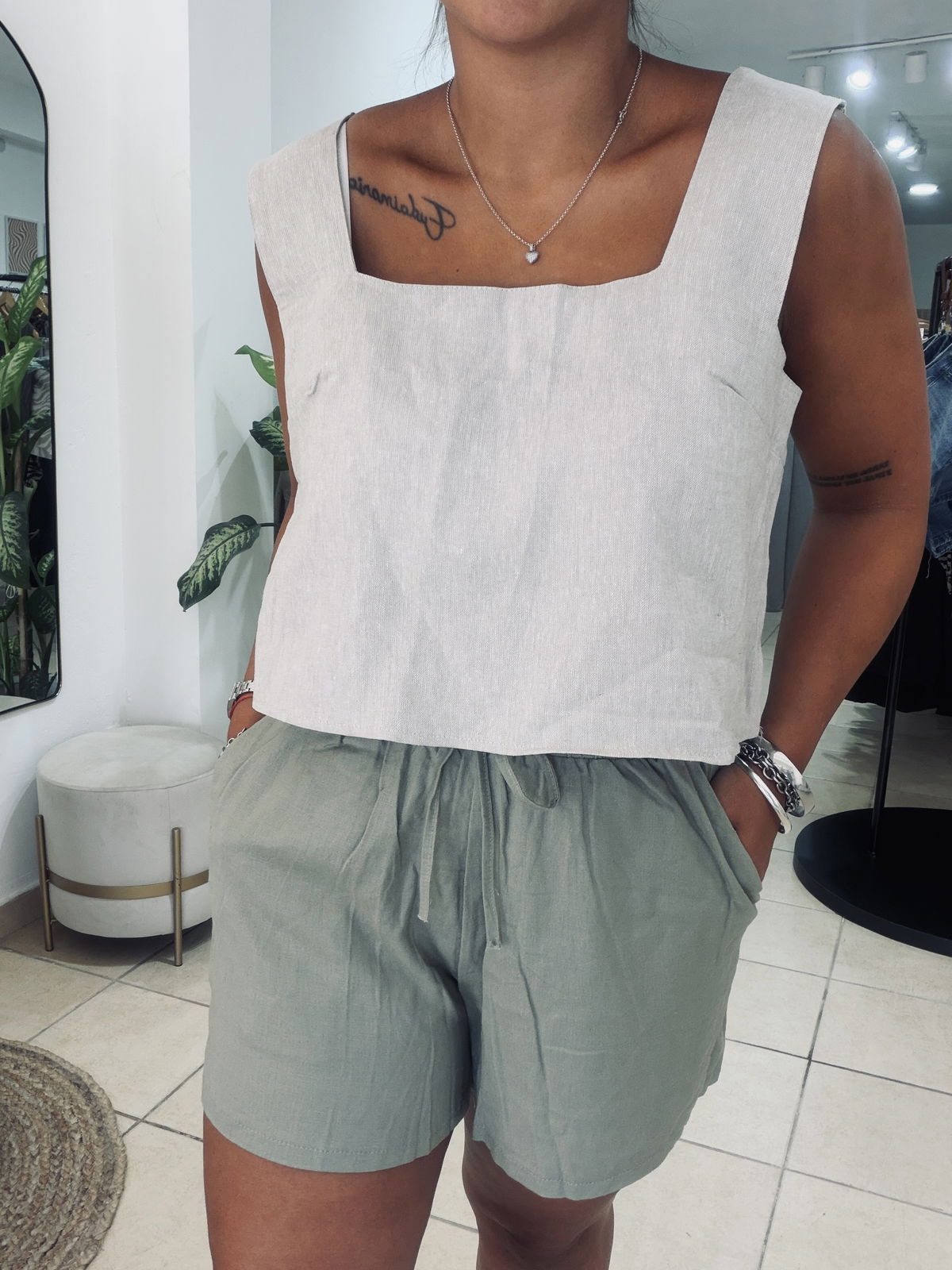 Short de lino con spandex, elástico en cintura un bolsillos. Súper cómodo, un básico para usar con zapas o para la pile! Va hasta un talle 42