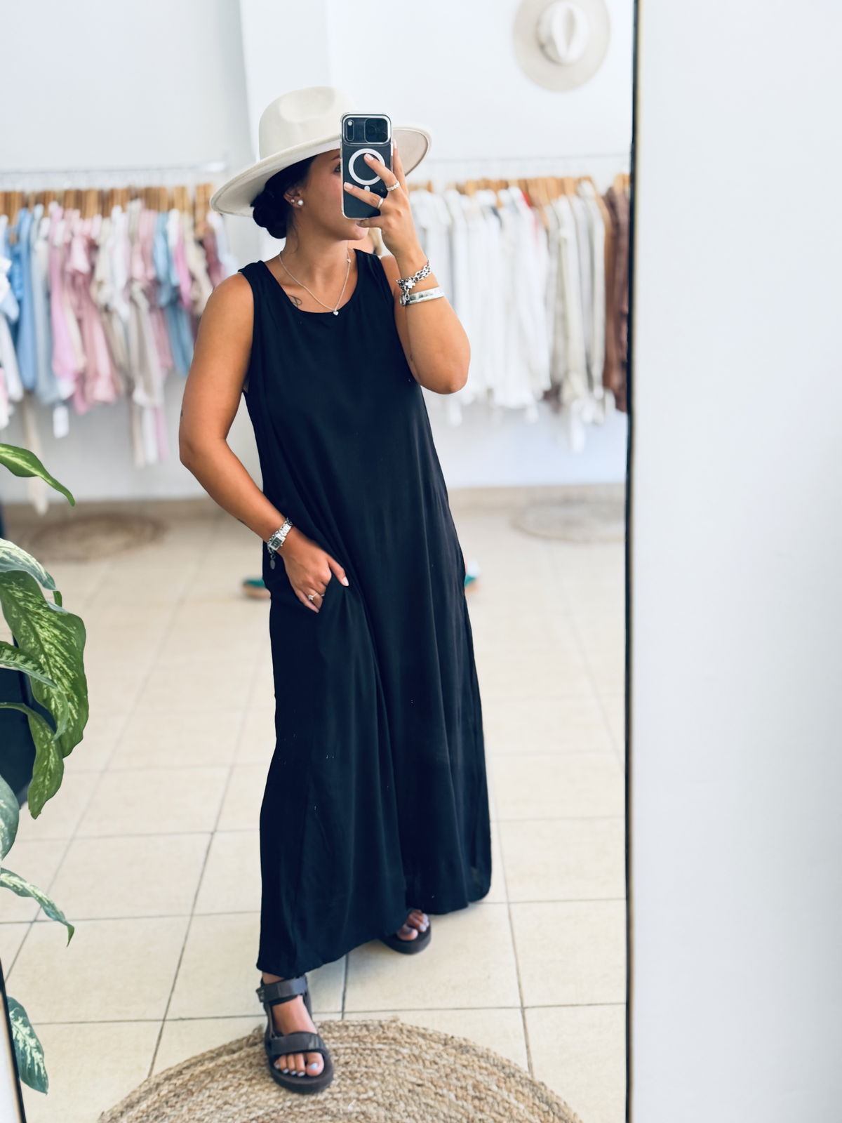 Vestido de lino, musculosa corte trapecio, cuellito redondo. largo hasta los tobillos, súper amplio, con bolsillos en laterales.
