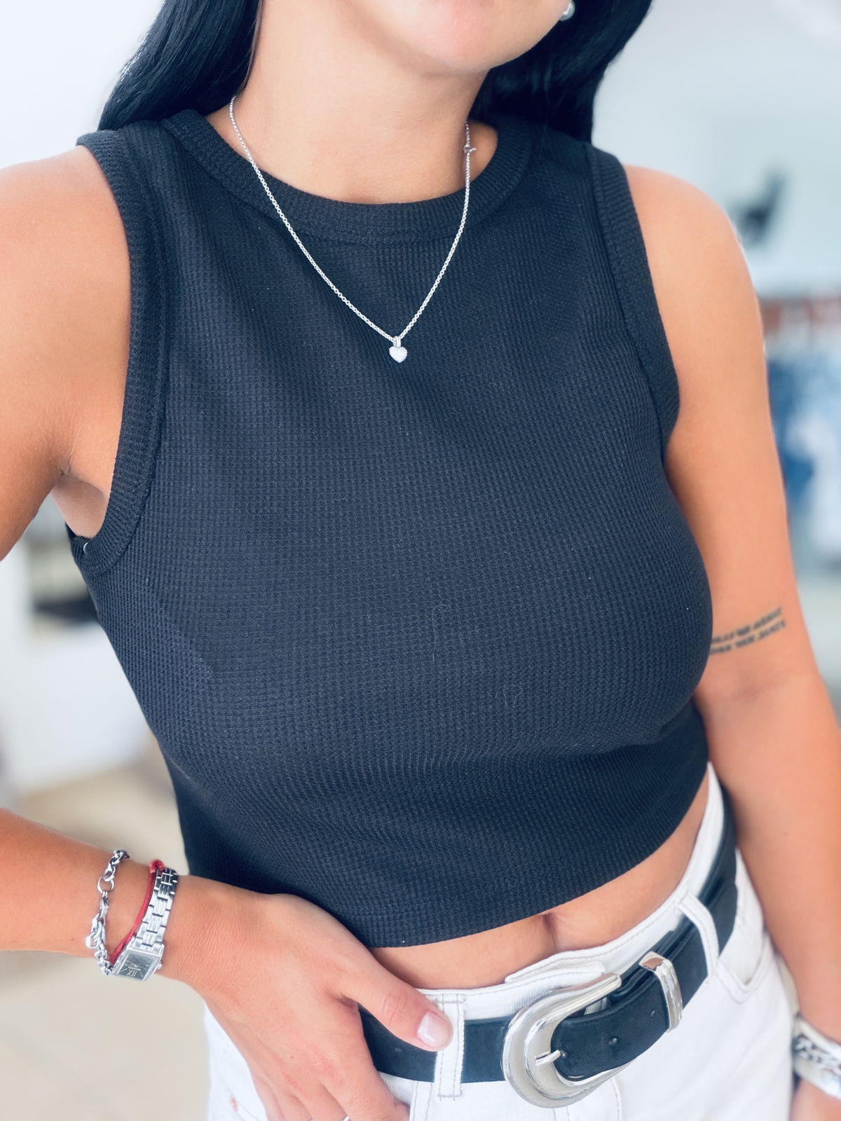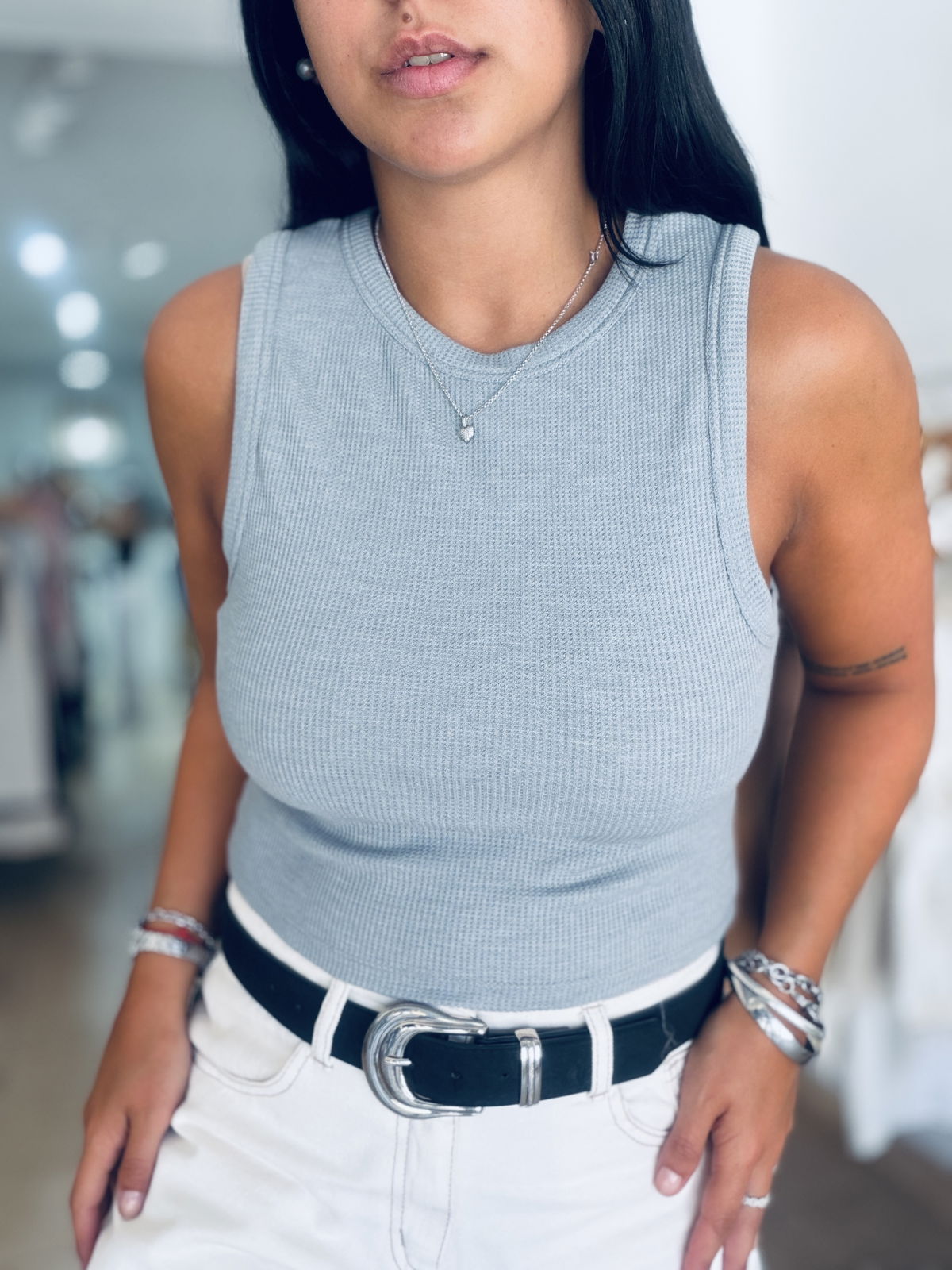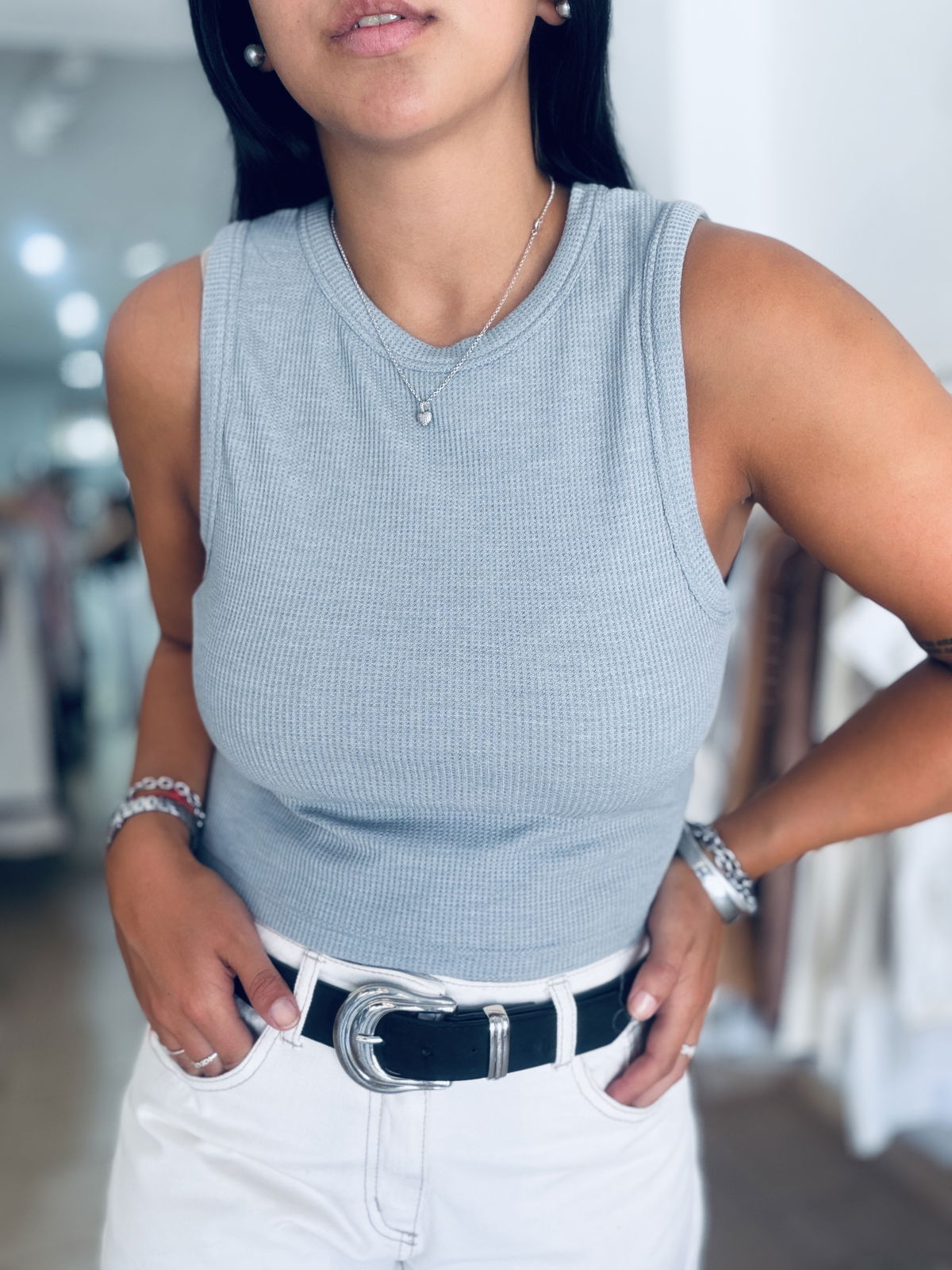 Musculosa top de waffle, cuello cerrado.