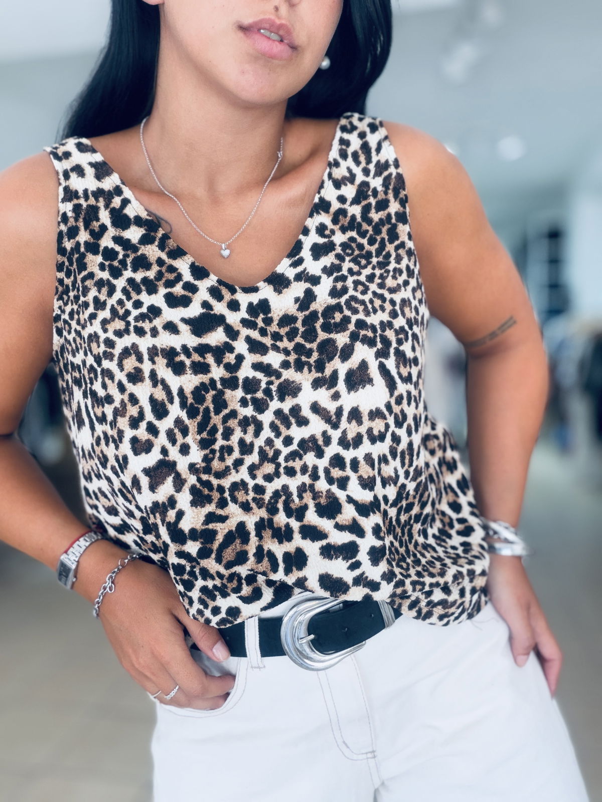 Musculosa animal Print cuello V, doble vista. La tela es texturada, super linda. Va hasta un talle L u es un modelo sueltito