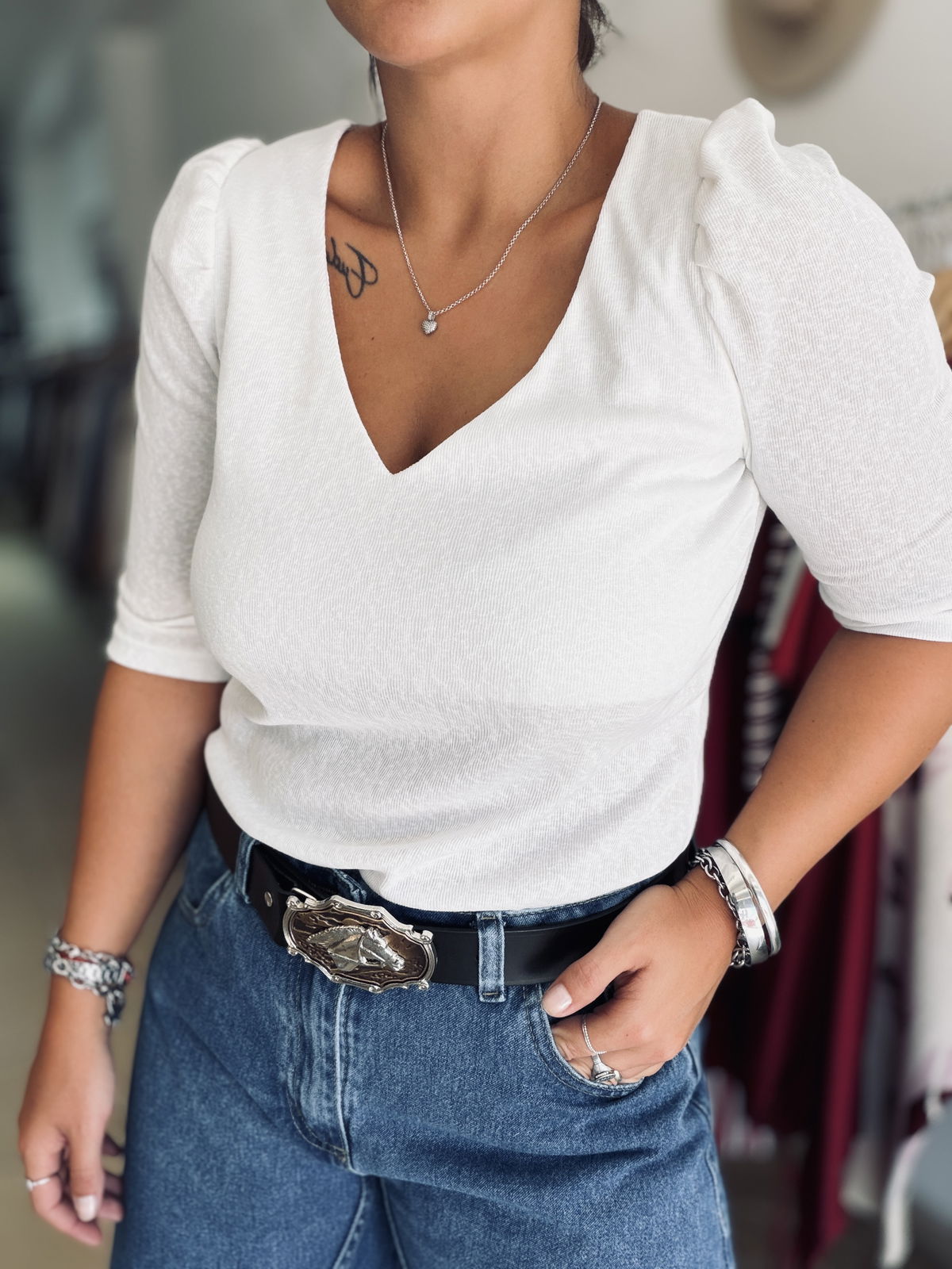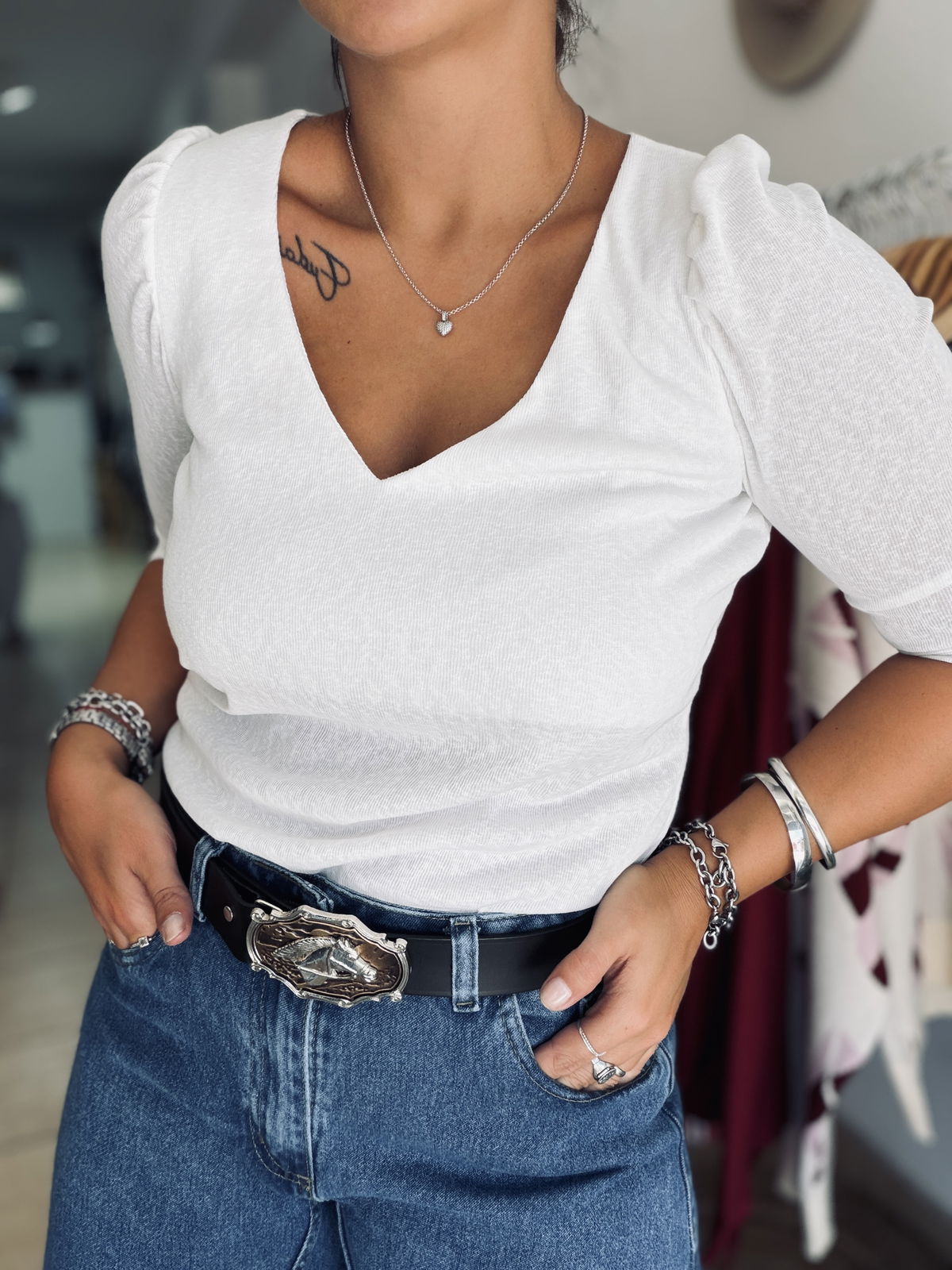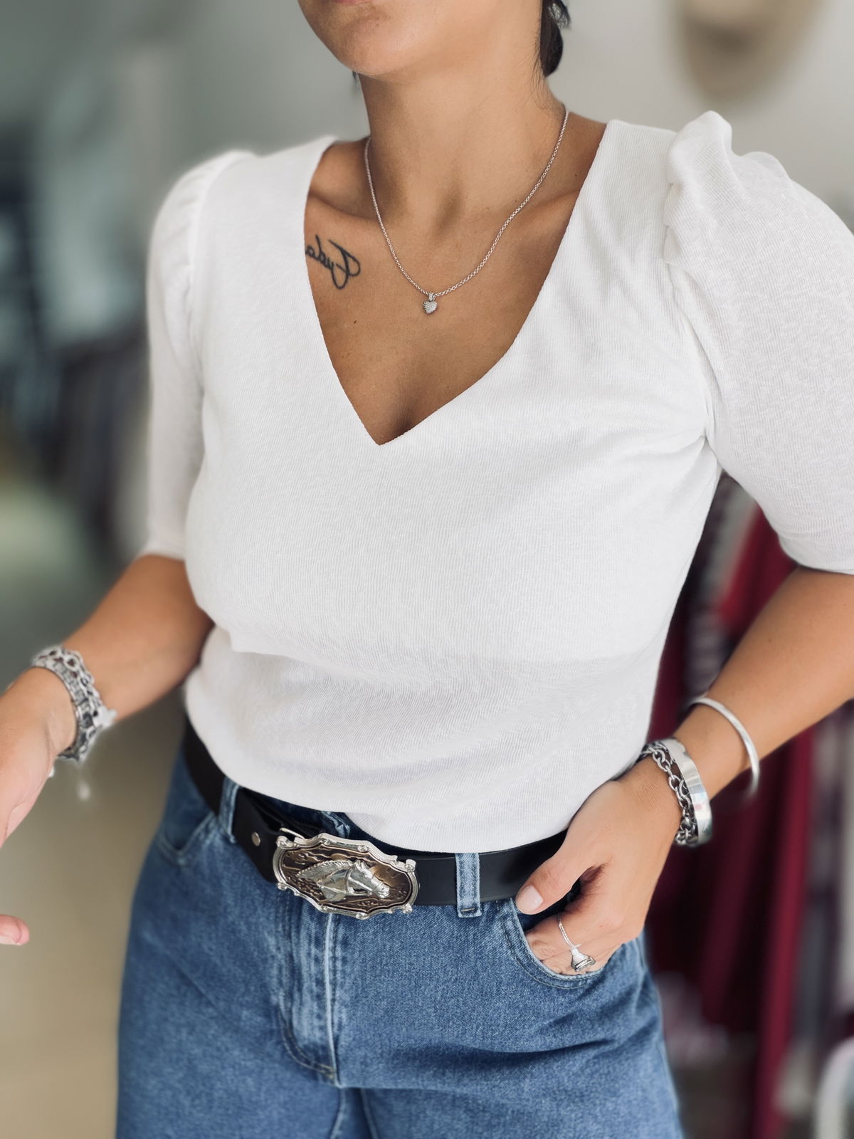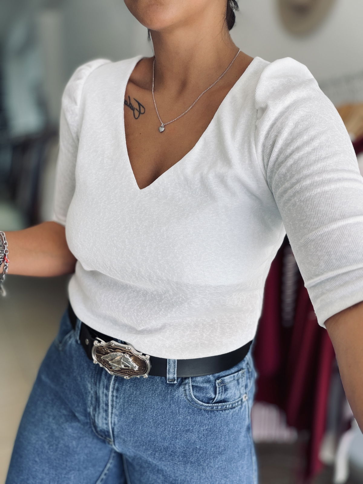 Remera con escote en V y mangas con leve frunce en hombros. Femenina y versátil, ideal para el día a día con un toque delicado.