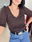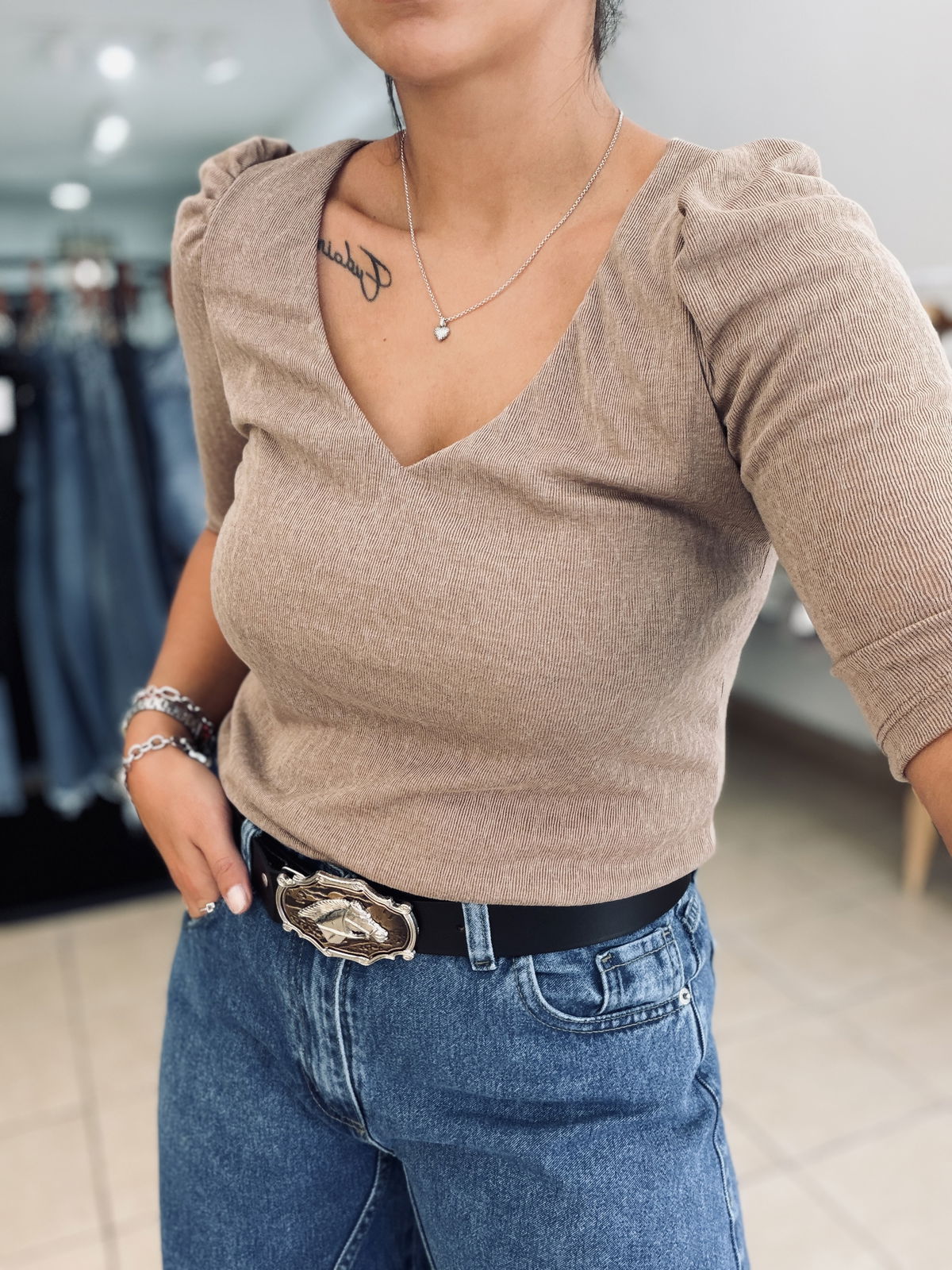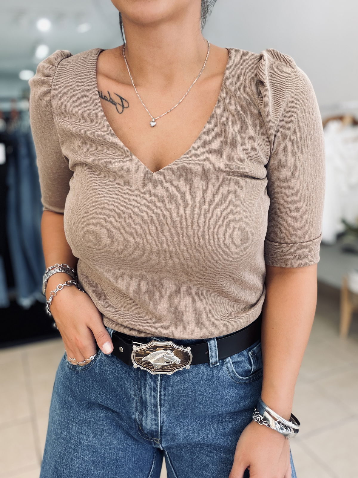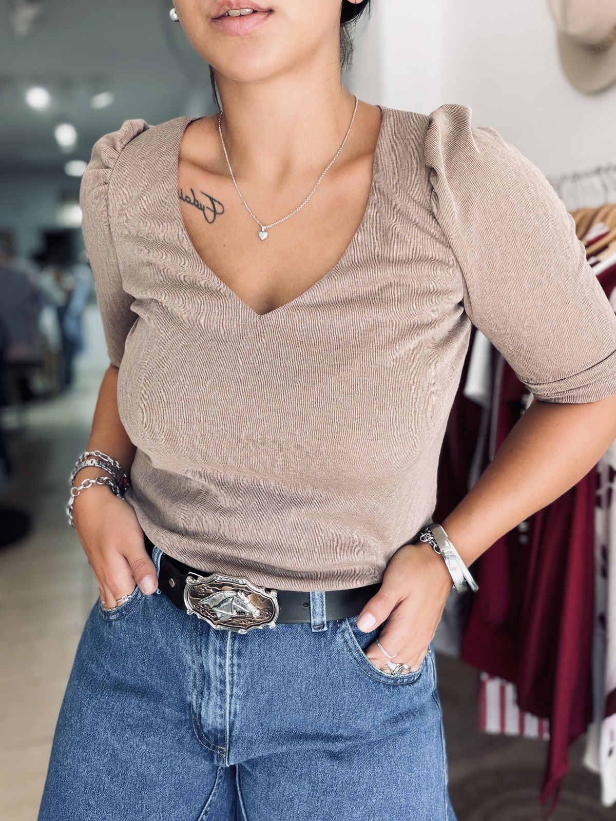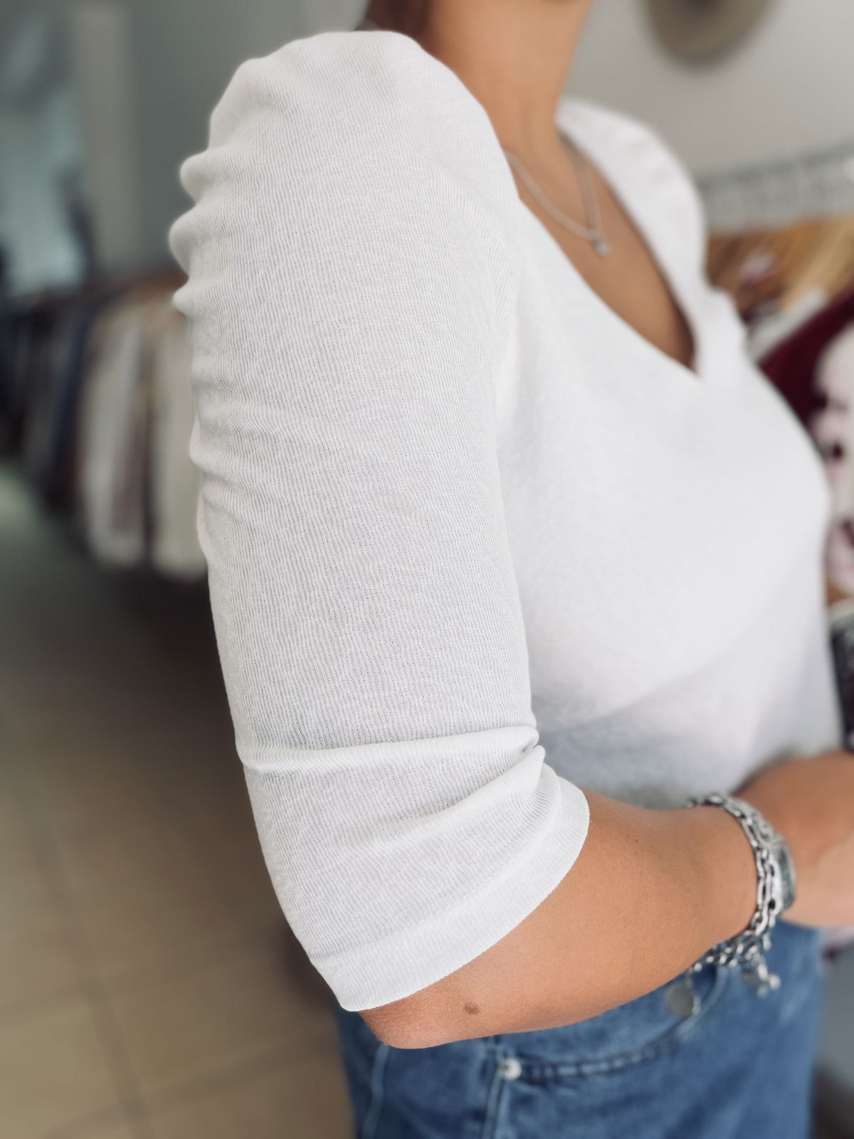 Remera con escote en V y mangas con leve frunce en hombros. Femenina y versátil, ideal para el día a día con un toque delicado.