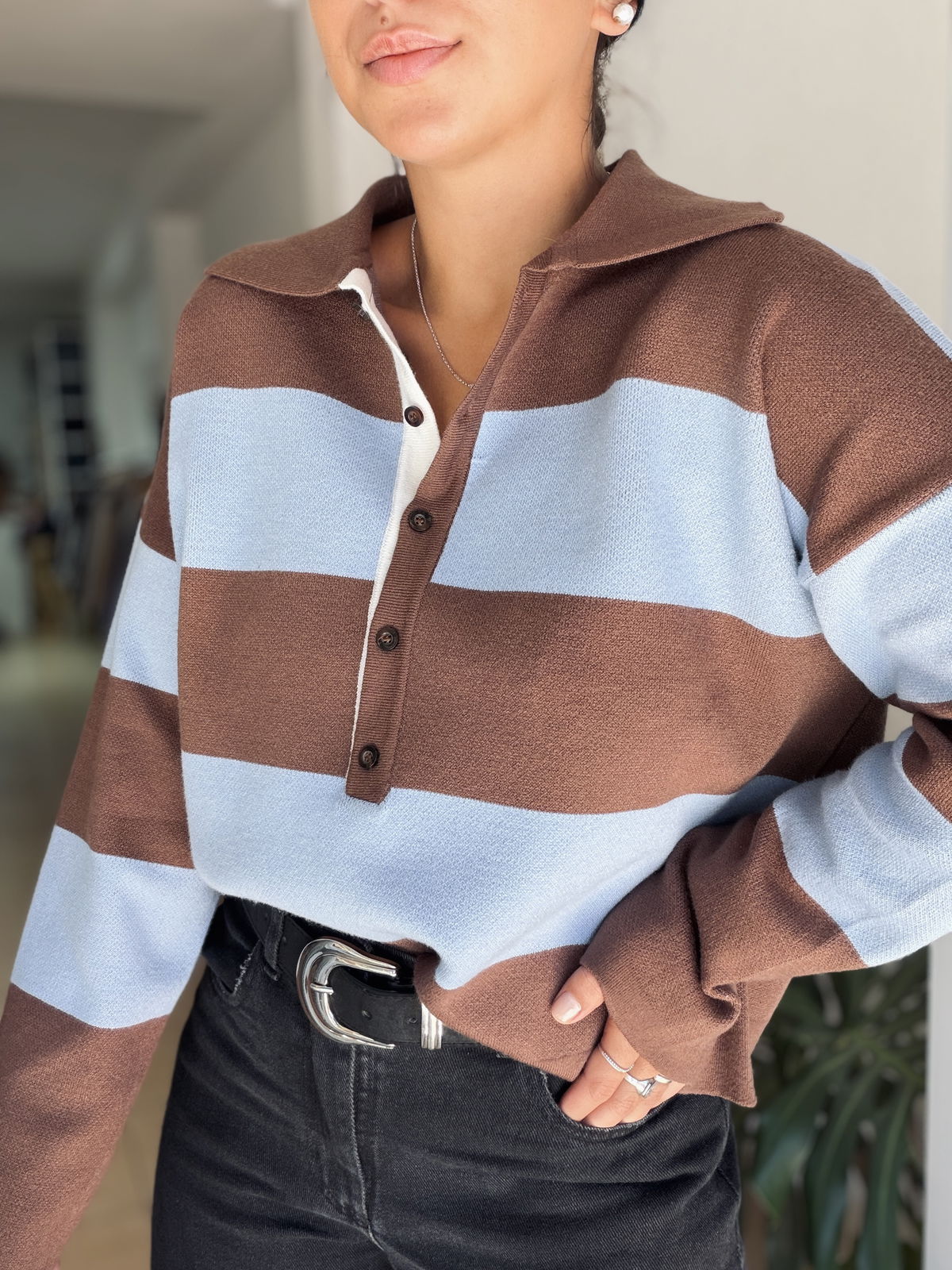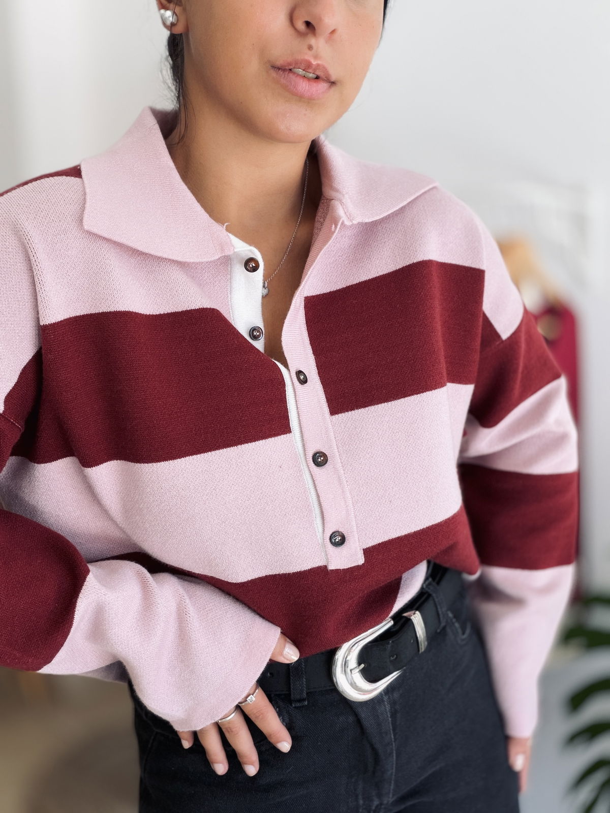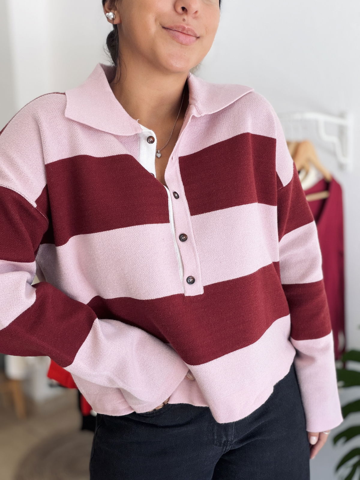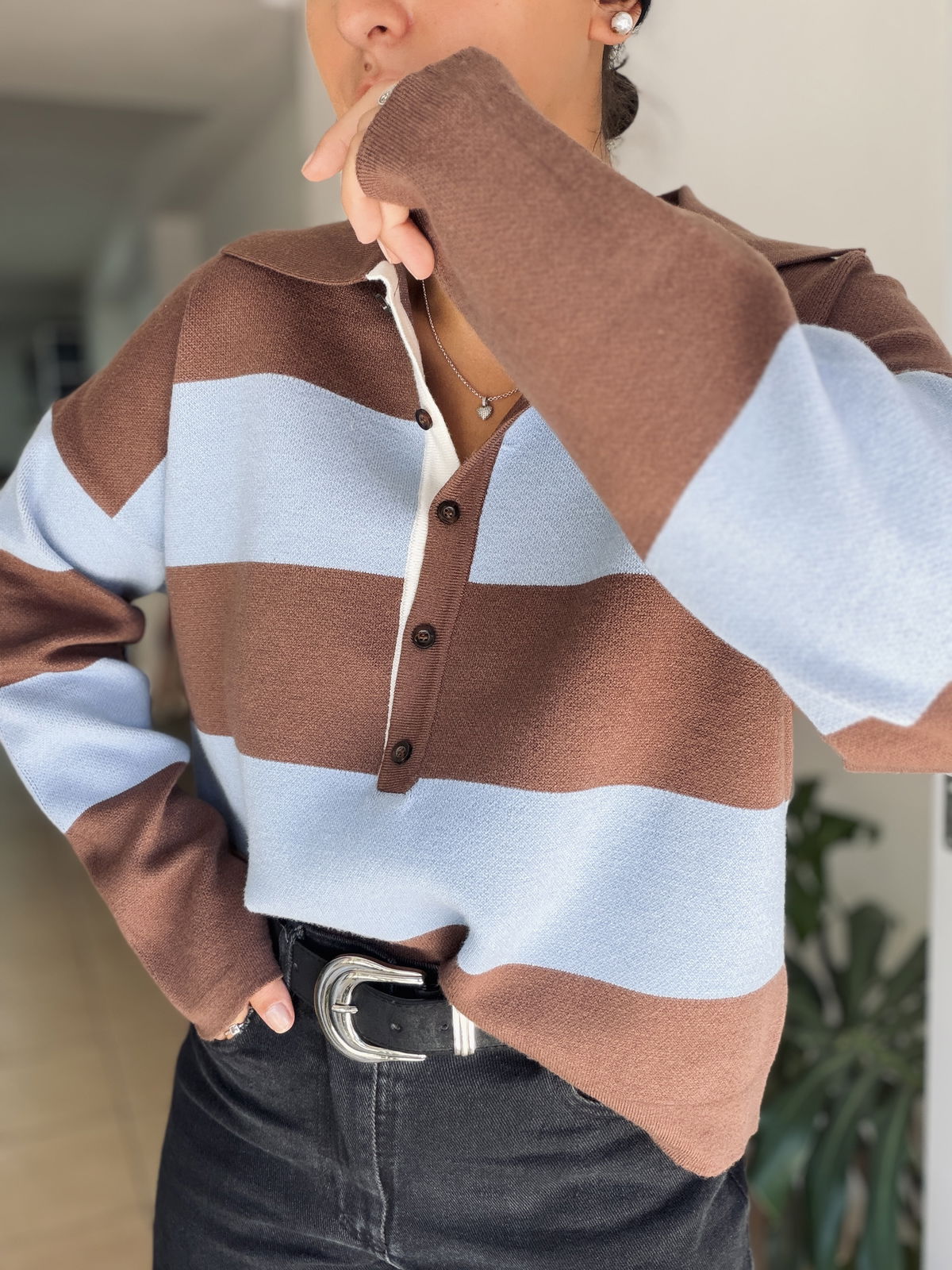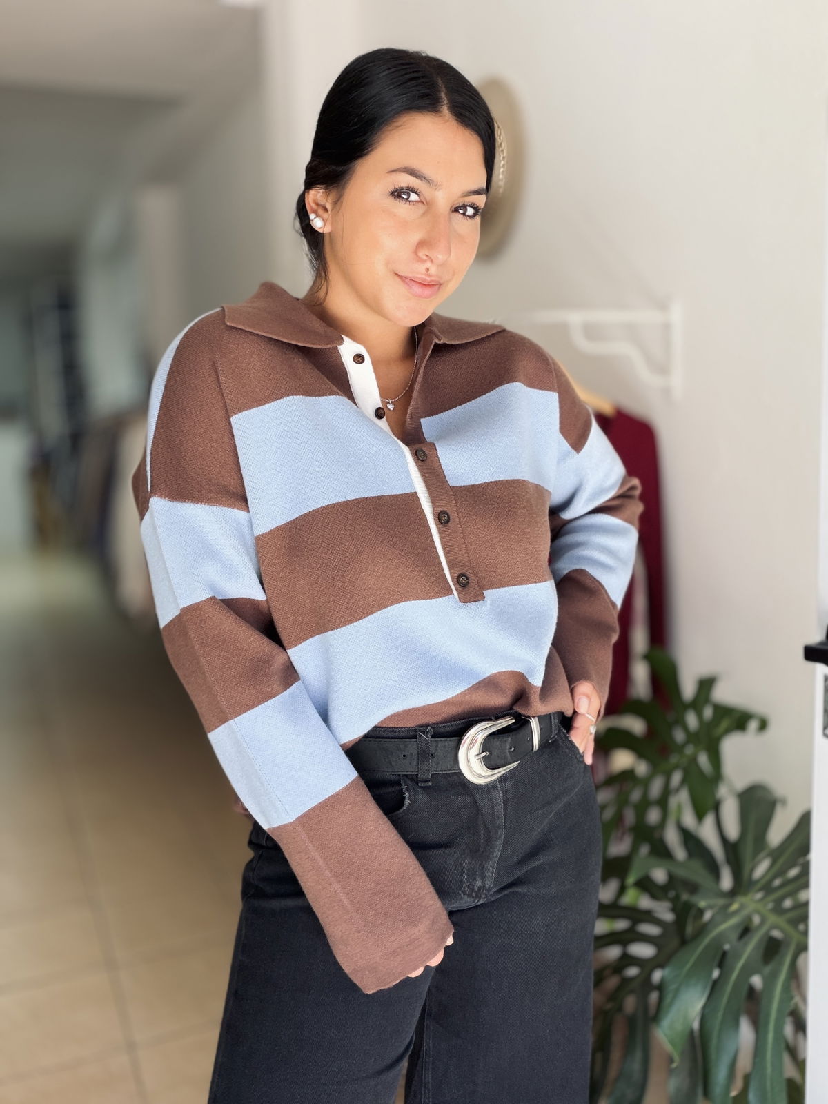 Sweater tejido de mangas largas con cuello tipo polo y cartera con botones. Su diseño de rayas amplias aporta un estilo clásico y relajado, ideal para looks de todos los días con un toque moderno. De calce cómodo, perfecto para combinar con jeans, pantalones sastreros o faldas.