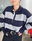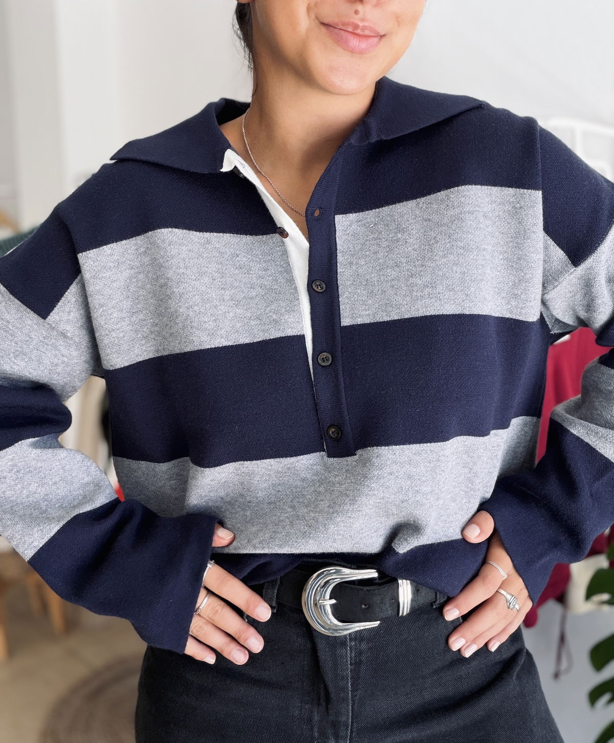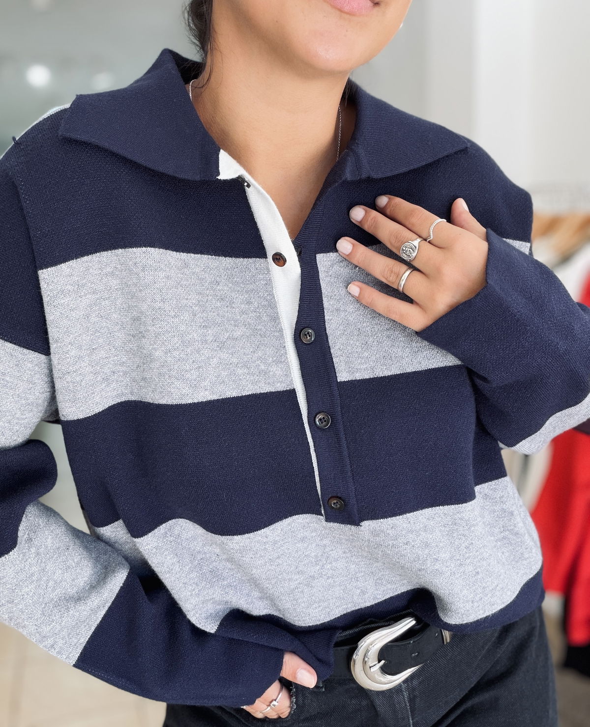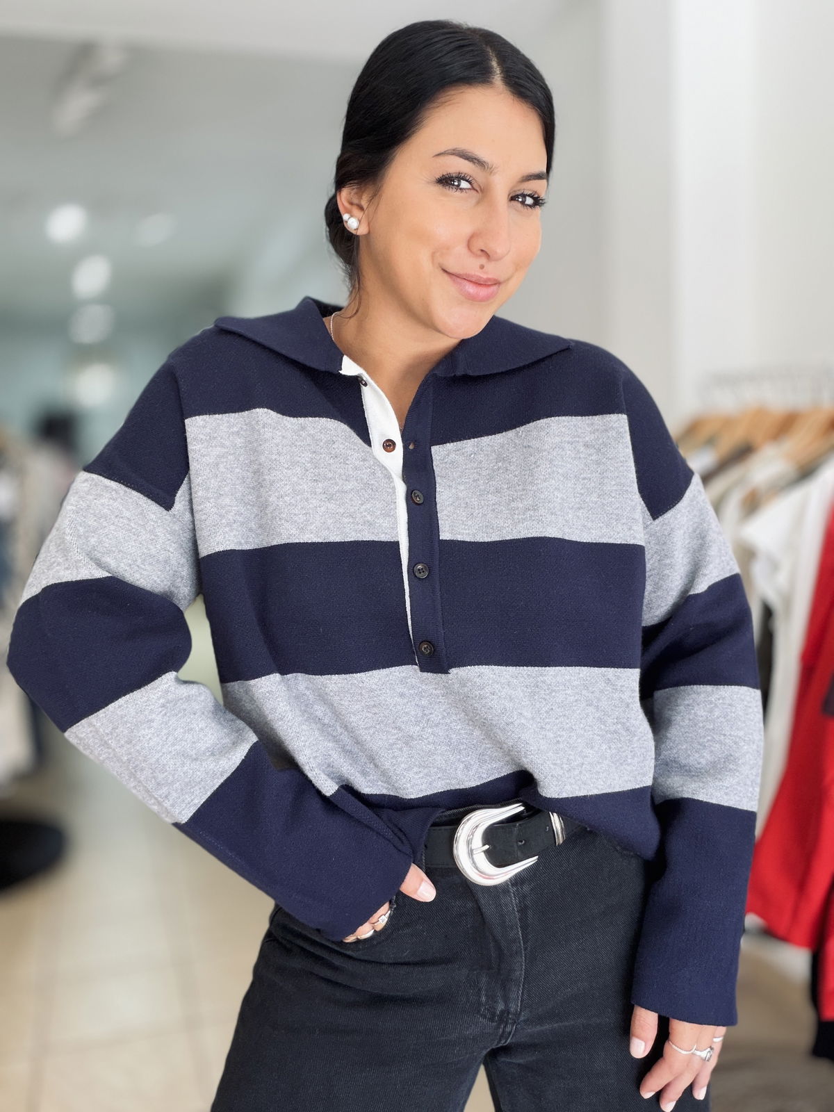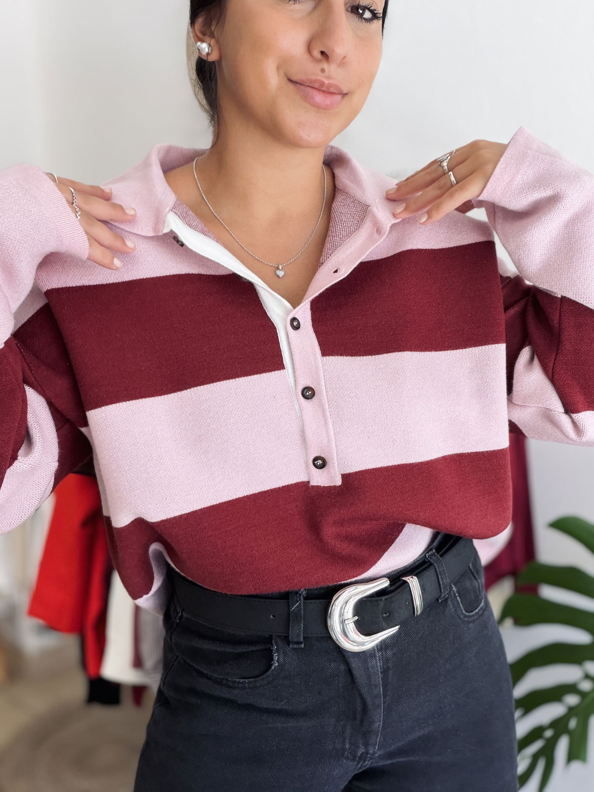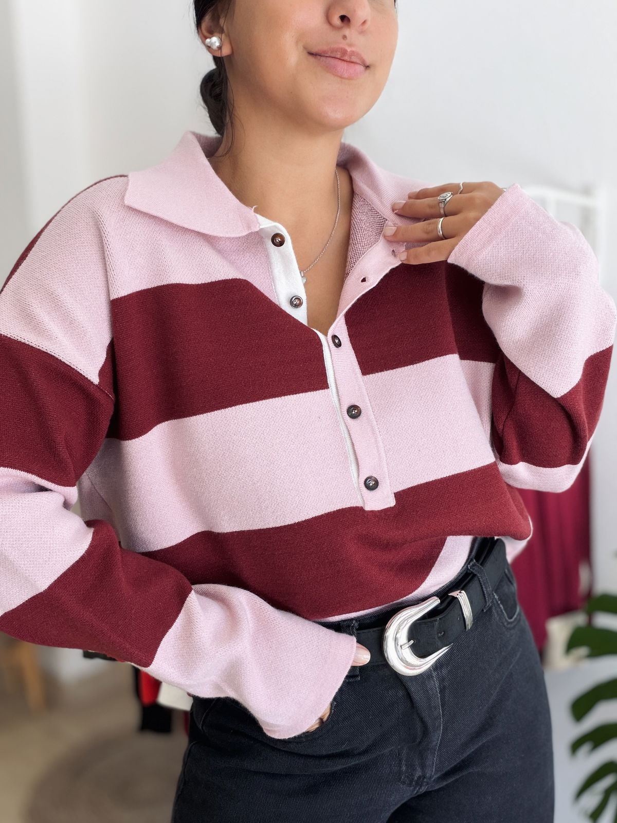 Sweater tejido de mangas largas con cuello tipo polo y cartera con botones. Su diseño de rayas amplias aporta un estilo clásico y relajado, ideal para looks de todos los días con un toque moderno. De calce cómodo, perfecto para combinar con jeans, pantalones sastreros o faldas.