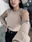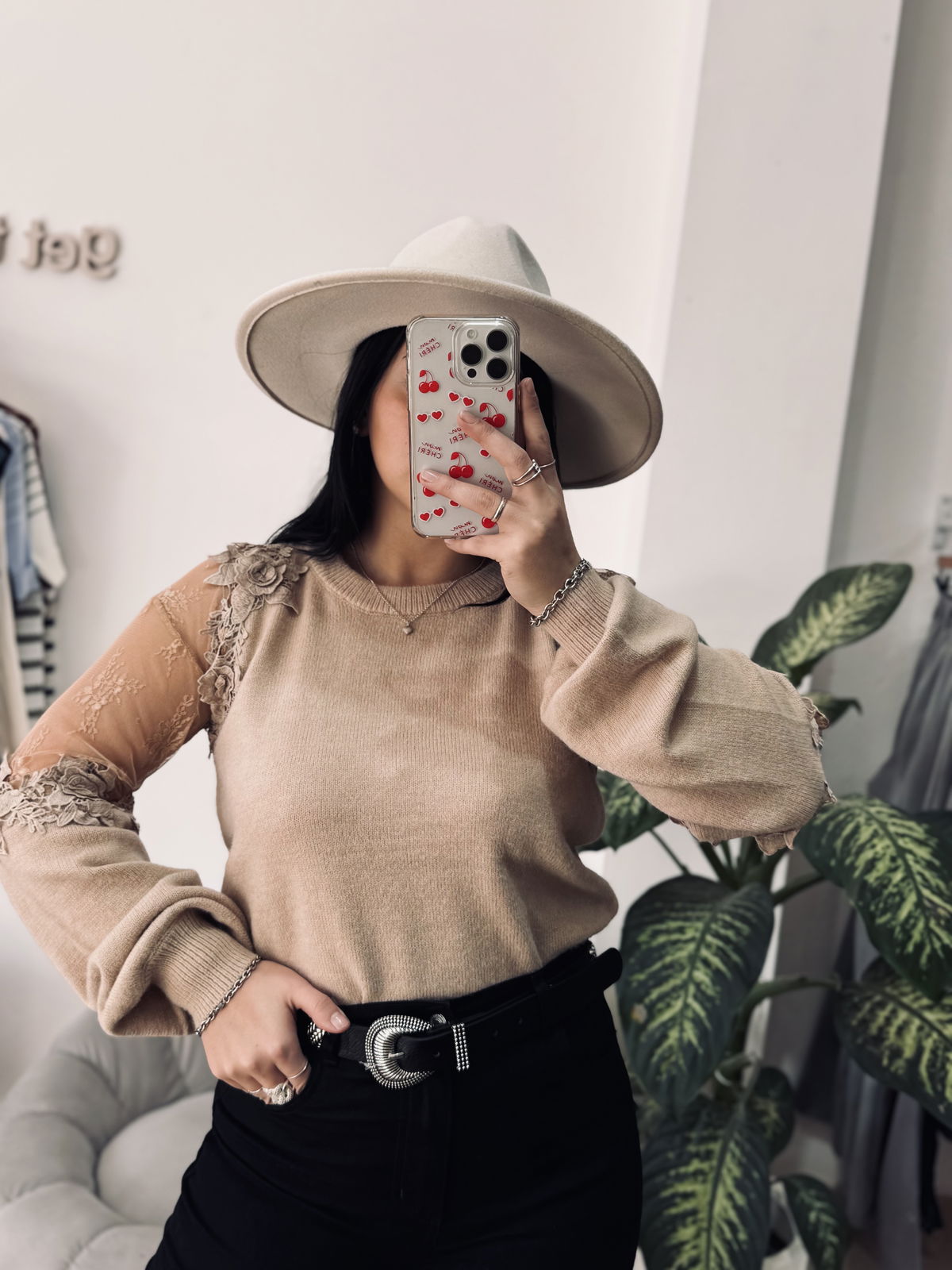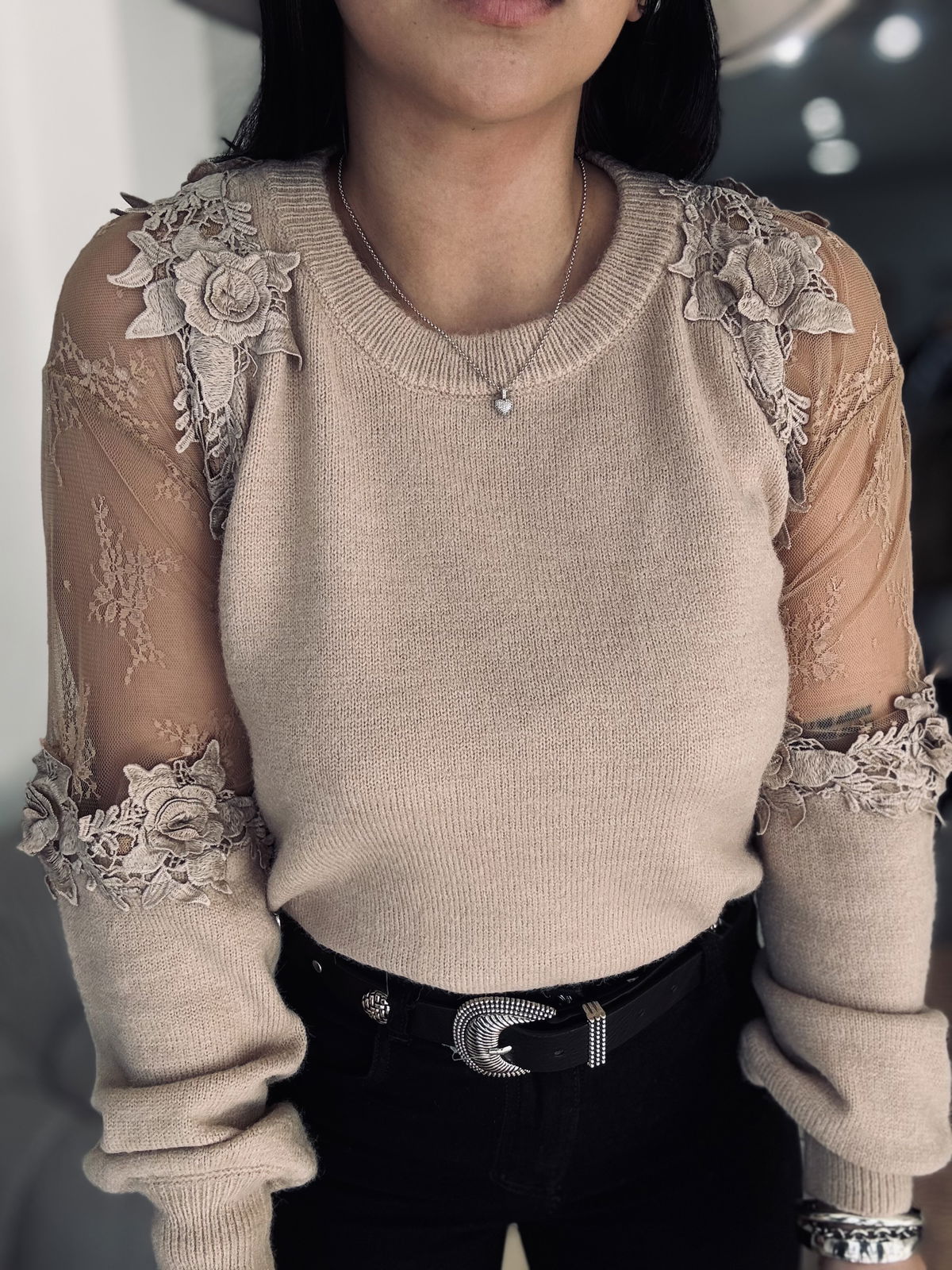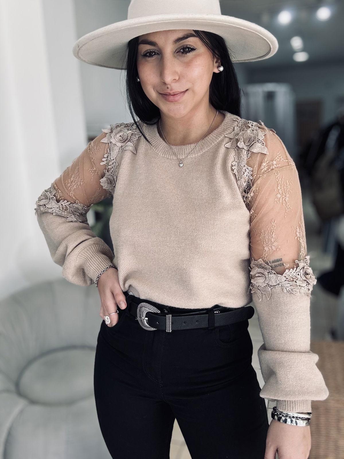 Sweater tejido con mangas en tul bordado y delicadas flores. Un diseño femenino y elegante que combina textura y transparencia para lograr un look sofisticado y romántico.